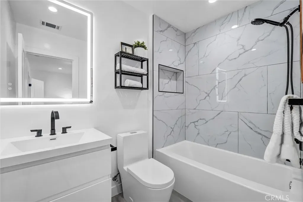 The private primary suite features a walk-in closet and a beautifully updated en-suite bath with a luxury shower, modern finishes, and a contemporary navy double-vanity. Two additional spacious bedrooms share a second fully remodeled bathroom with premium fixtures and tilework. A dedicated in-home laundry area adds convenience and function.