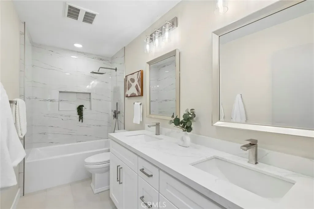 Welcome to 24422 Aphena, a beautifully reimagined, fully upgraded & re-piped home nestled in the heart of Mission Viejo. Extensive, high-quality renovations throughout, this residence offers the perfect blend of modern luxury, comfort & SoCal living. Step inside to a spacious, thoughtfully designed floor plan enhanced by abundant natural light & brand-new dual-pane, Low-E windows & sliders. Updated, 100% waterproof 12mm laminate flooring flows seamlessly through the home, complemented by fresh Dunn-Edwards interior & exterior paint, creating a clean & contemporary aesthetic. Fully remodeled kitchen is a true showstopper, featuring quartz countertops w/a dramatic waterfall edge, stunning designer backsplash, soft-close cabinetry & drawers, custom lighting including under-cabinet illumination & a full suite of brand-new appliances. Opening effortlessly to the dining & family areas, making it ideal for both everyday living & entertaining. All 3 bathrooms have been completely renovated w/upscale finishes. Downstairs bedroom & Full bathroom offer added convenience. The primary bathroom boasts a spa-like retreat w/large-format marble hexagon tile, deep freestanding designer soaking tub, custom frameless glass shower w/rainfall showerhead, oversized niche & built-in bench. Quartz countertops, elegant soft-close cabinetry & shower wands elevate all bathrooms w/both style & function. The primary suite is further enhanced by a beautifully remodeled closet showcasing tailored cabinetry by Closet Evolution, offering both organization & luxury. Additional interior upgrades include recessed lighting, modernized ceiling fans, new outlets, switches & dimmers, upstairs hallway nightlights & refinished contemporary-style fireplaces w/striking 5ft floating mantels. Major system improvements provide peace of mind, including a full home re-pipe & brand-new roof. Step outside to a private & tranquil backyard, thoughtfully upgraded w/added drainage, new front yard landscaping, updated fence & additional hillside sprinklers. Brand-new 14×8 louvered canopy system w/adjustable opening & closing features creates a perfect shaded outdoor space for relaxing or entertaining. Further enhancements include recently installed front door, side garage door, mirrored wardrobe doors & all-new locksets/doorknobs. Ideally located mins from the Civic Center, Oso Creek walking trails, Mission Viejo Library, The Shops at Mission Viejo & a variety of dining, shopping & everyday conveniences. NO HOA