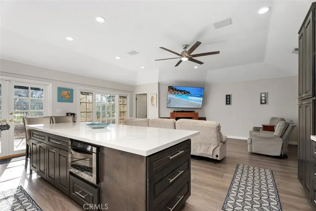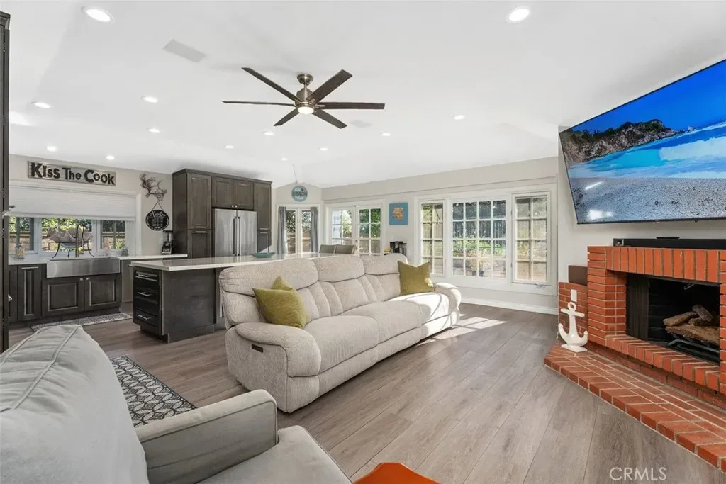 This approximately 2,297 square foot single-level home offers three bedrooms and two and a half bathrooms. The open floor plan features a remodeled kitchen with high-end Z-Line stainless steel appliances, oversized quartz island, subway tile back splash and new custom cabinetry. The primary bedroom is large with access to backyard and includes an upgraded bathroom, and the home has vaulted ceilings and a whole-house fan for comfort. The living room and dining room each have a fireplace, as well as the family room, creating a warm and inviting atmosphere. The secondary bedrooms are conveniently located near the remodeled secondary bathroom. The home has been repiped in pex-piping, includes new ducting, washer and dryer in closet and interior paint.