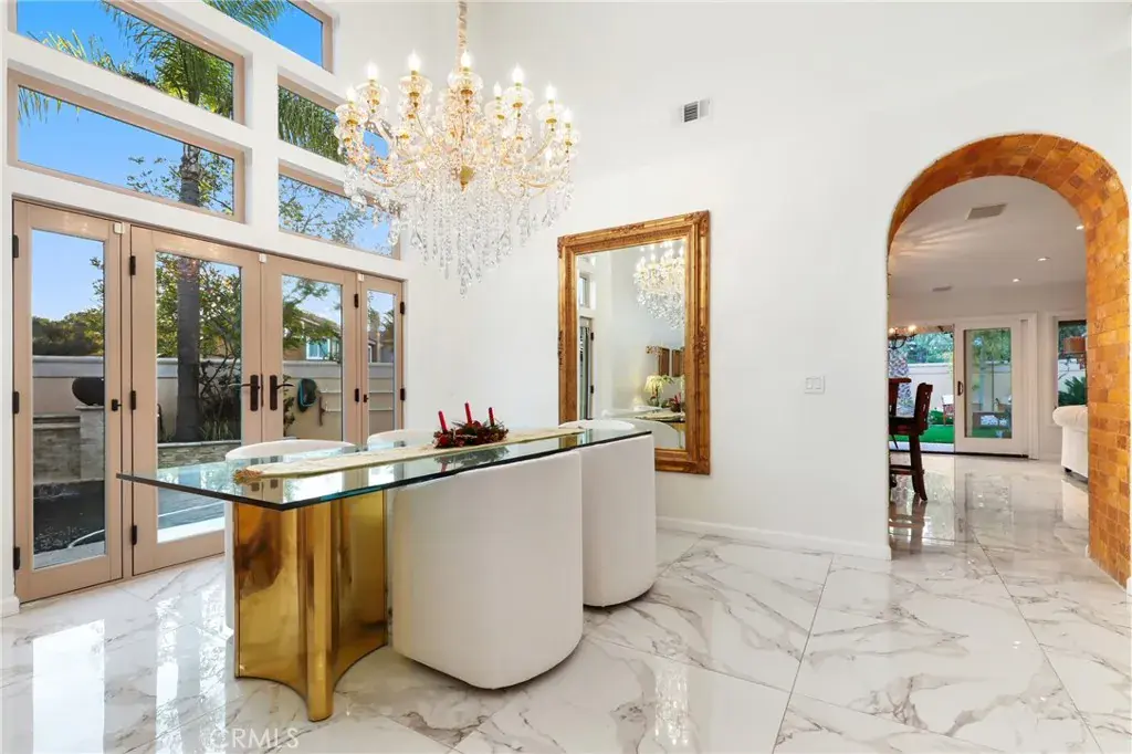 Enter through a grand foyer with soaring cathedral ceilings, dramatic crystal chandeliers, and expansive marble-look porcelain flooring that enhances the home’s bright and elegant ambiance. Layered windows and custom French doors frame the sparkling pool and waterfall, creating a breathtaking first impression.