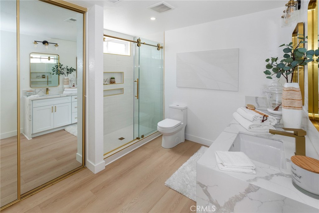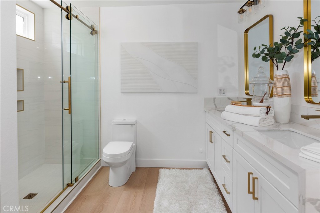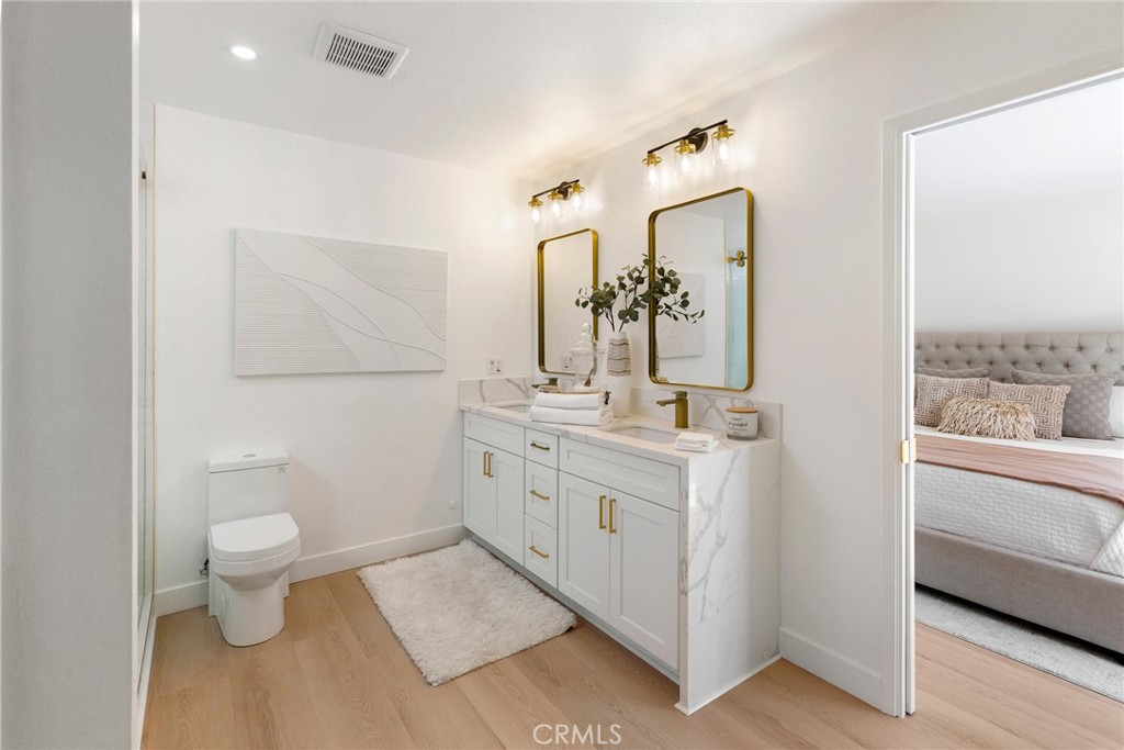 The primary suite offers a spa like retreat with a walk in shower featuring oversized shampoo niches, double vanities with quartz counters, soft close cabinetry, and upgraded fixtures. All bathrooms have been fully remodeled with modern cabinets, countertops, faucets, mirrors, and low flow toilets. Each bedroom has new flooring, baseboards, paint, and lighting for a fresh, modern feel. Additional smart home features include a Nest thermostat, Ring camera doorbell, and a full PEX repipe for added peace of mind.