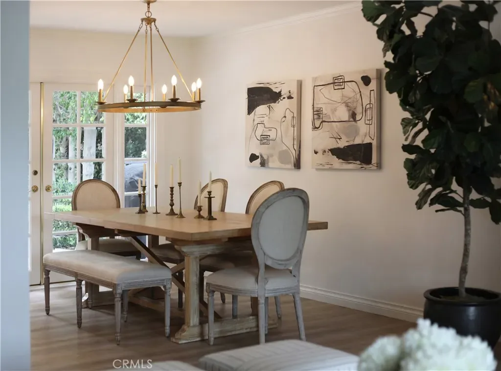 Inside, the home opens to a light-filled interior highlighted by vaulted ceilings with beautifully exposed beams, soft natural finishes, crown molding, traditional touches, and a cohesive, well-designed layout. The main living areas flow effortlessly together, anchored by a cozy fireplace and complemented by expansive windows and French doors that bring the outdoors in. The result is a space that feels both elevated and comfortable, ideal for everyday living or hosting.