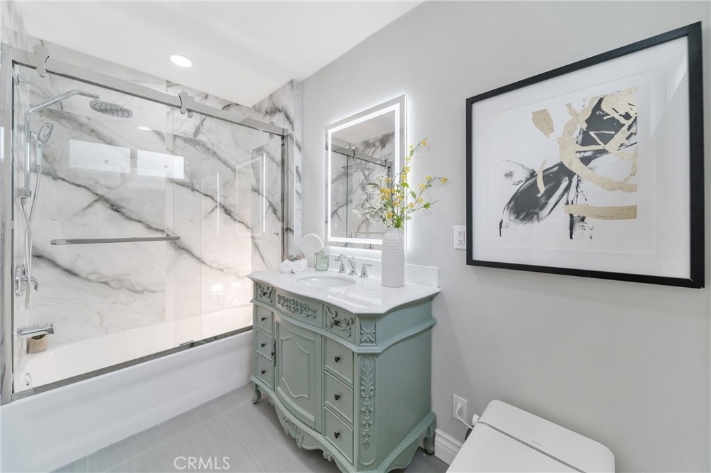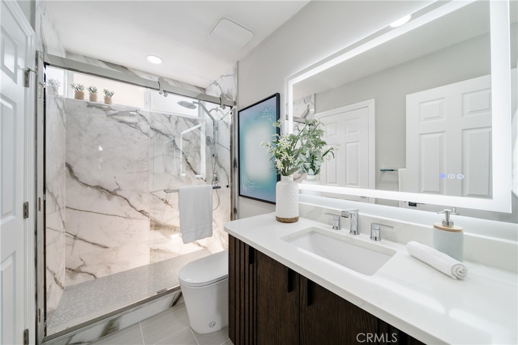 Each bedroom enjoys high ceilings for an enhanced sense of space and comfort. All bathrooms have been completely renovated with spa-like designs, featuring frameless glass showers with large-format marble-look porcelain tiles, rainfall shower heads, and elegant vanities with LED backlit mirrors that provide a soft, modern glow.