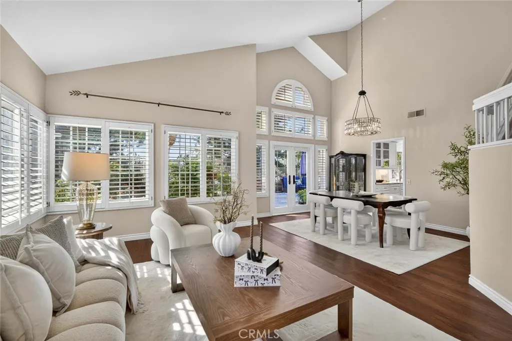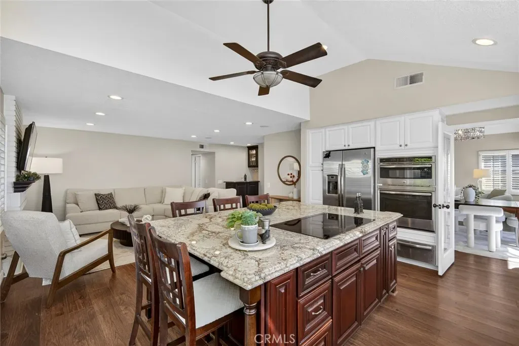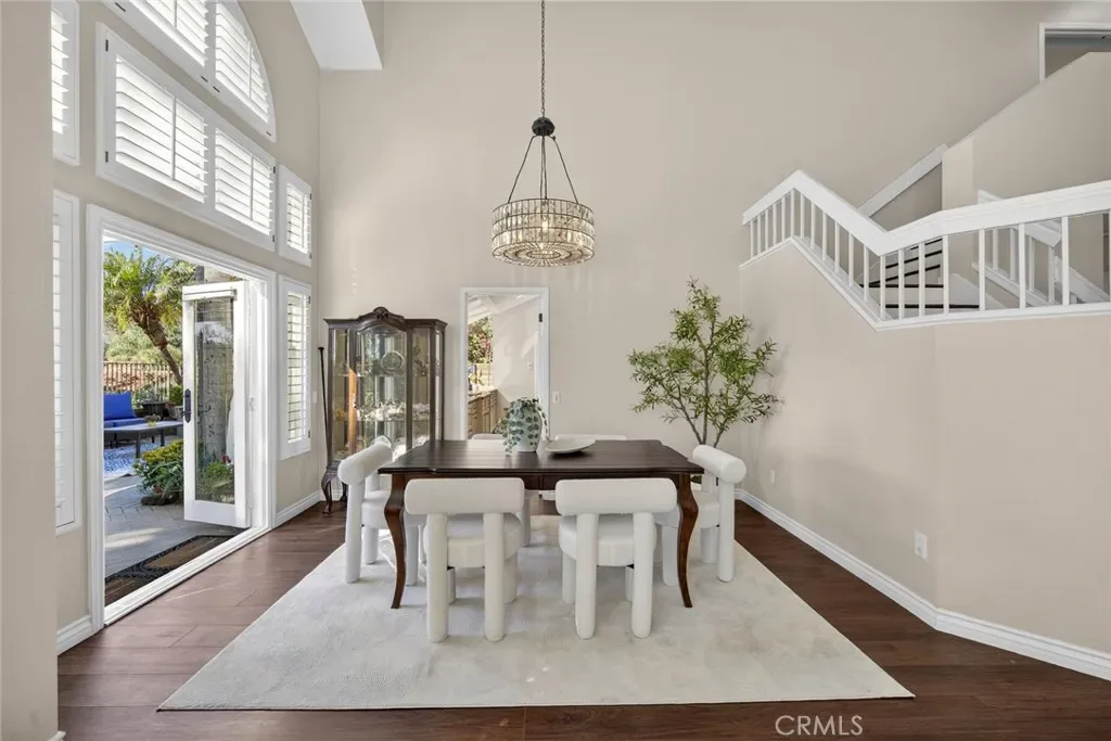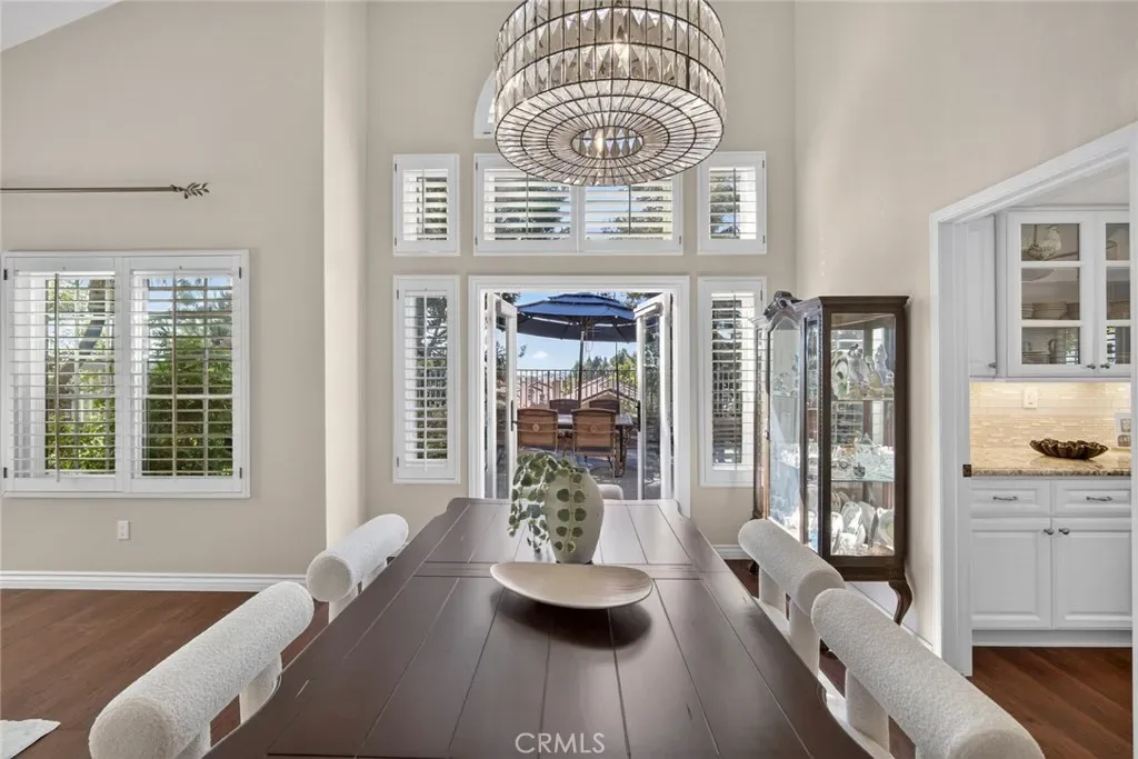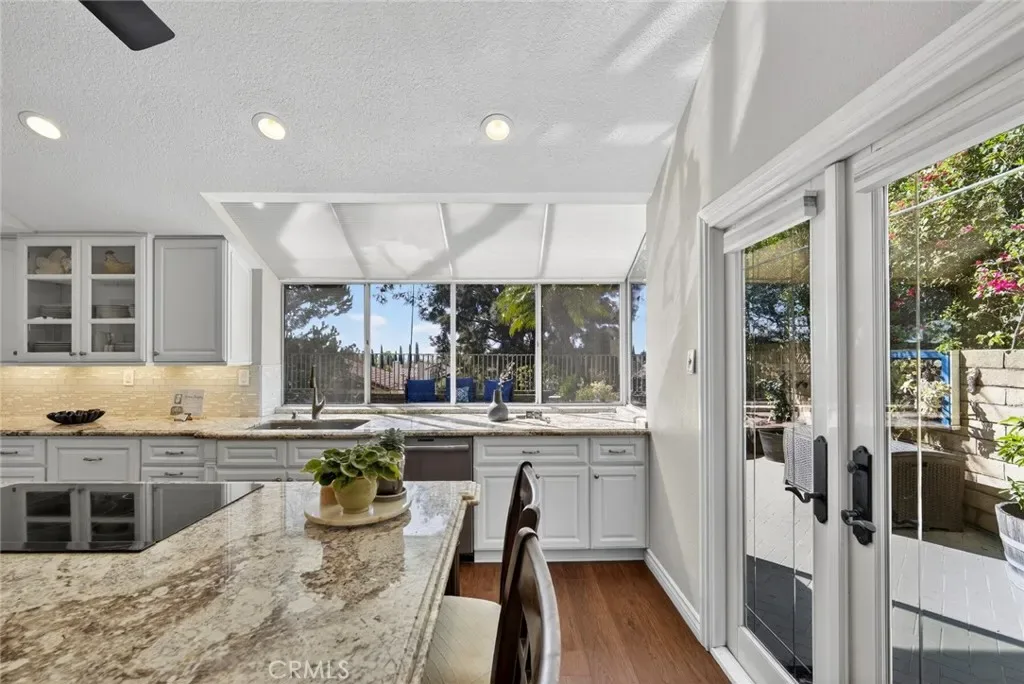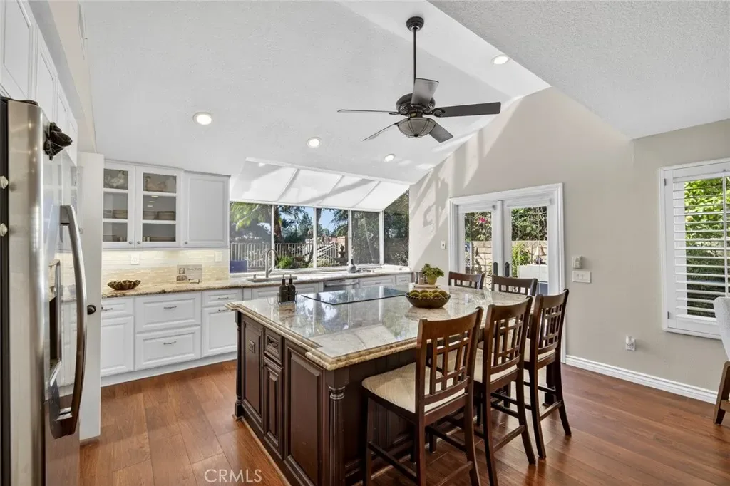 Nestled in a highly sought-after South Mission Viejo neighborhood, this beautifully upgraded 4-bedroom, 3-bathroom home offers approximately 2,520 square feet of light-filled living space with a versatile floor plan. A custom Dutch door welcomes you into the living and dining area, highlighted by expansive cathedral ceilings that create an impressive sense of space. The remodeled kitchen features expanded cabinetry with glass accents, a large granite island, pull-out storage, upgraded appliances, under-cabinet lighting, and a charming greenhouse window. A stylish wet bar with wine refrigerator adds to the home’s entertaining appeal.