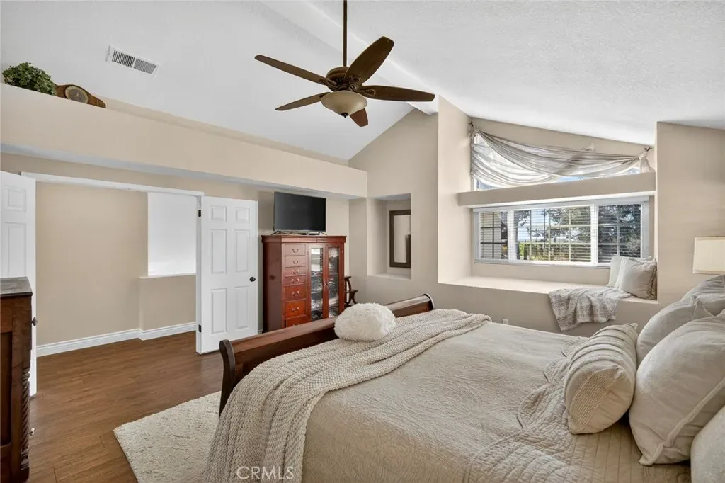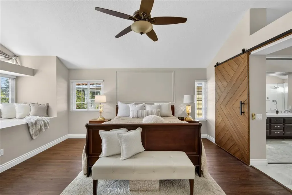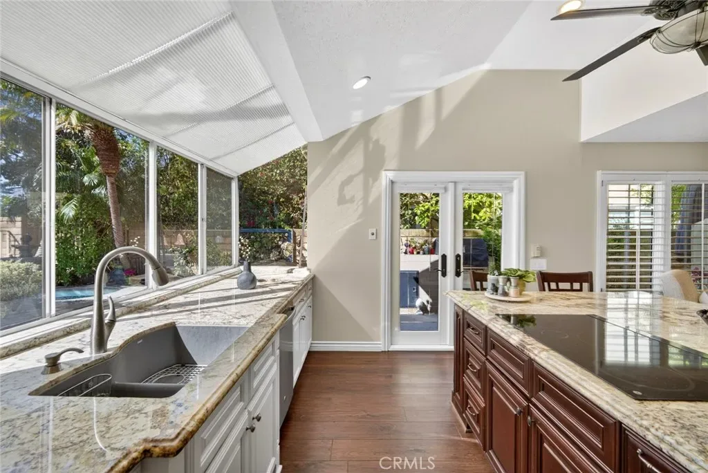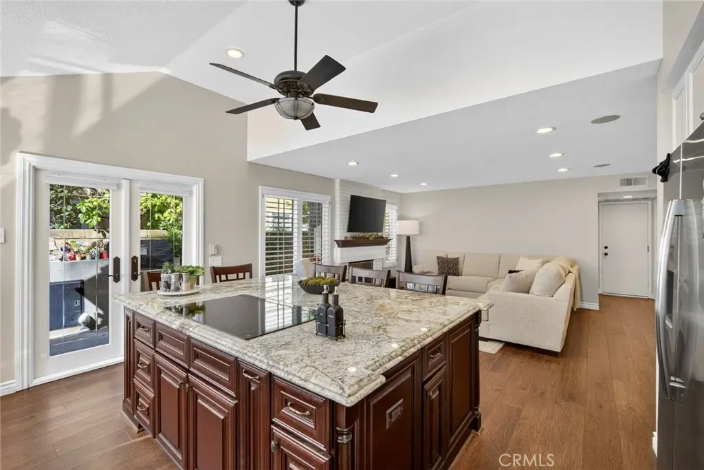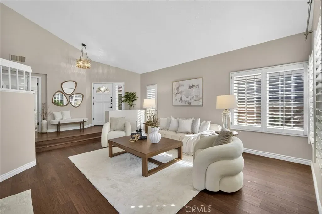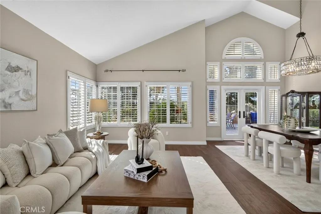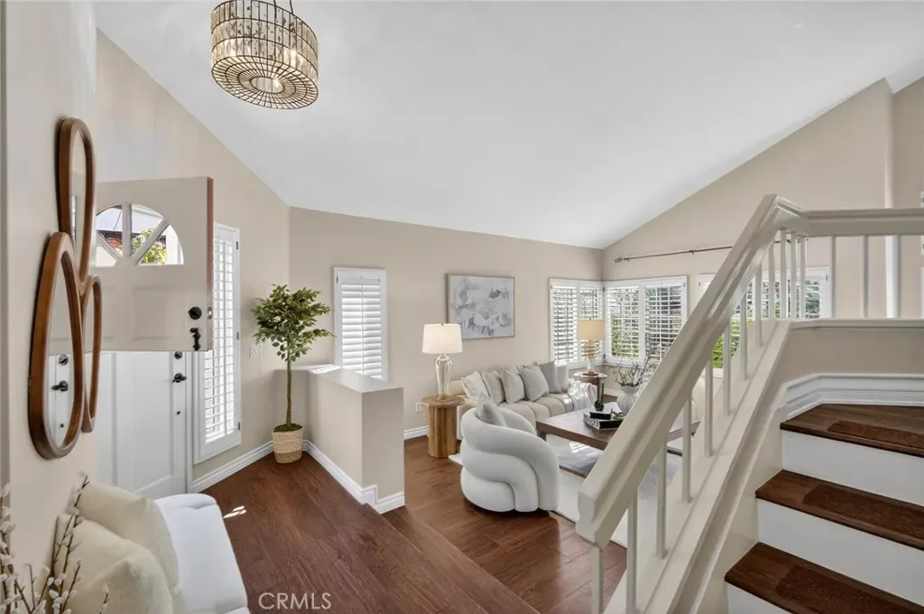 Nestled in a highly sought-after South Mission Viejo neighborhood, this beautifully upgraded 4-bedroom, 3-bathroom home offers approximately 2,520 square feet of light-filled living space with a versatile floor plan. A custom Dutch door welcomes you into the living and dining area, highlighted by expansive cathedral ceilings that create an impressive sense of space. The remodeled kitchen features expanded cabinetry with glass accents, a large granite island, pull-out storage, upgraded appliances, under-cabinet lighting, and a charming greenhouse window. A stylish wet bar with wine refrigerator adds to the home’s entertaining appeal.