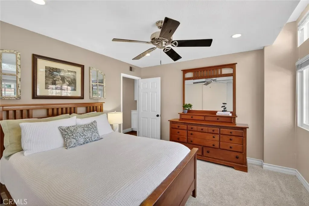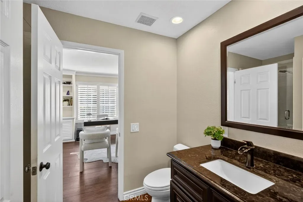 Throughout the home, enjoy wide-plank luxury vinyl flooring, upgraded baseboards, recessed lighting with dimmers, and plantation shutters. A desirable main-floor bedroom and updated bath with seamless glass shower offer flexibility for guests or a home office. Upstairs, the spacious primary suite includes a custom barn door and an updated bathroom with Carrara marble, dual vanities, and modern finishes. Secondary bedrooms offer comfort with plush carpeting and ceiling fans. The backyard is designed for both relaxation and entertaining, featuring panoramic views, an expanded patio, paver walkways, BBQ island, and a spa. Additional highlights include fully paid solar, upgraded plumbing with epoxy pipe lining, dual-pane windows (including recent replacements), and a three-car garage. Ideally located near parks, shopping, dining, and Mission Viejo amenities, this home blends comfort, style, and location.