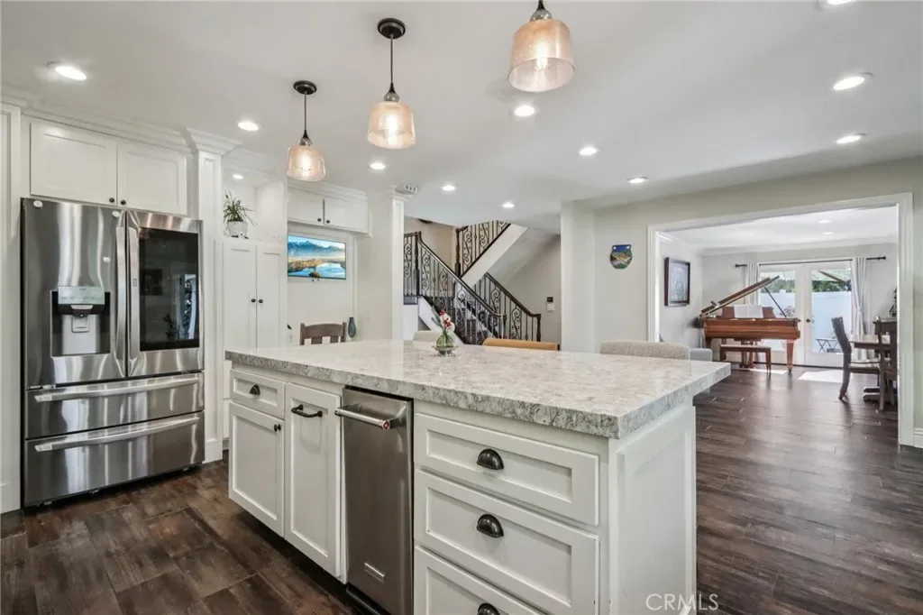 Welcome to this beautifully upgraded Mission Viejo home offering impressive curb appeal and exceptional indoor-outdoor living. Inside, the upgraded kitchen features white cabinetry, quartz countertops, a glass tile backsplash, a center island with breakfast bar, and stainless steel appliances—perfectly designed for both everyday living and entertaining. Wood-like tile flooring, recessed lighting, and custom built-ins enhance the home’s stylish and functional interior.