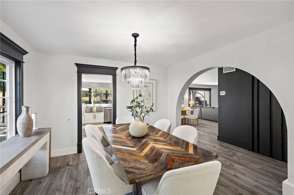 From the moment you arrive, this exceptional four bedroom, three bath residence captivates with a presence that simply feels like the one! The dramatic entry showcases a striking architectural staircase accented by custom wood slats with concealed storage, updated flooring and a statement chandelier that draws the eye upward. The open-concept living and dining areas, designed to maximize natural light, flow effortlessly from the foyer and are highlighted by a beautifully refreshed fireplace with custom built-in cabinetry and shelving, complemented by updated flooring—ideal for both everyday living and refined entertaining.