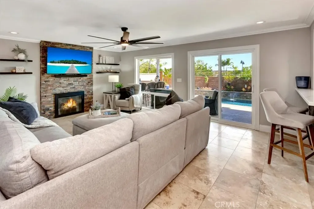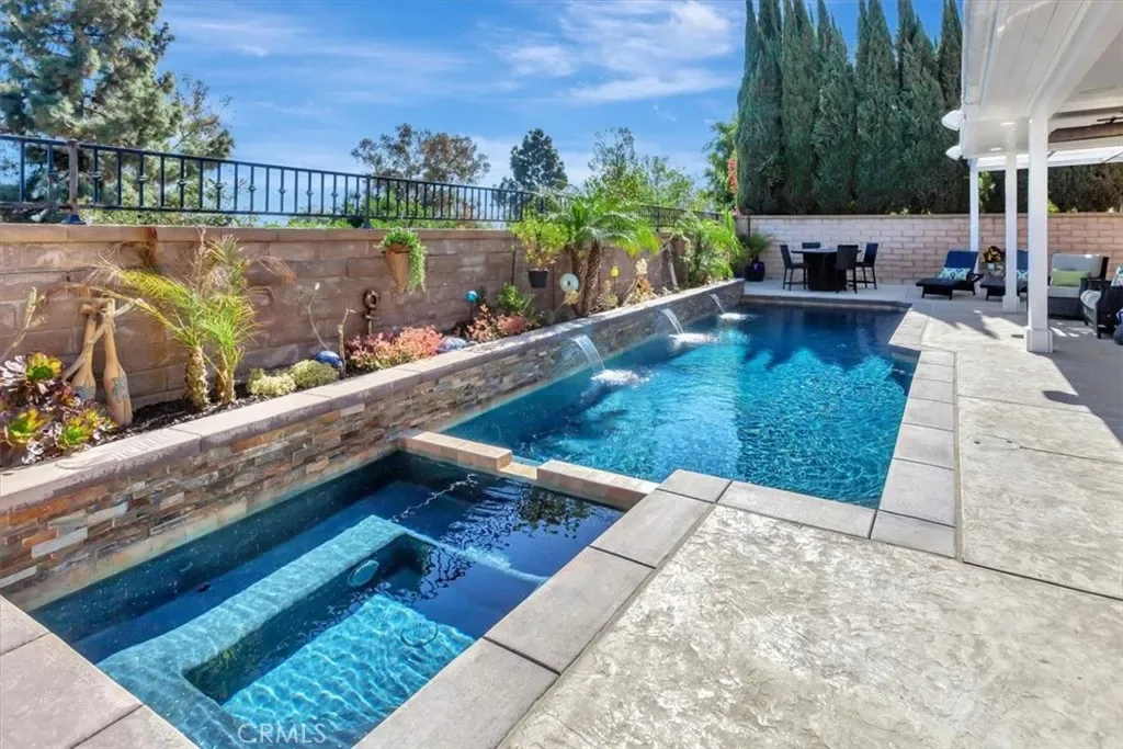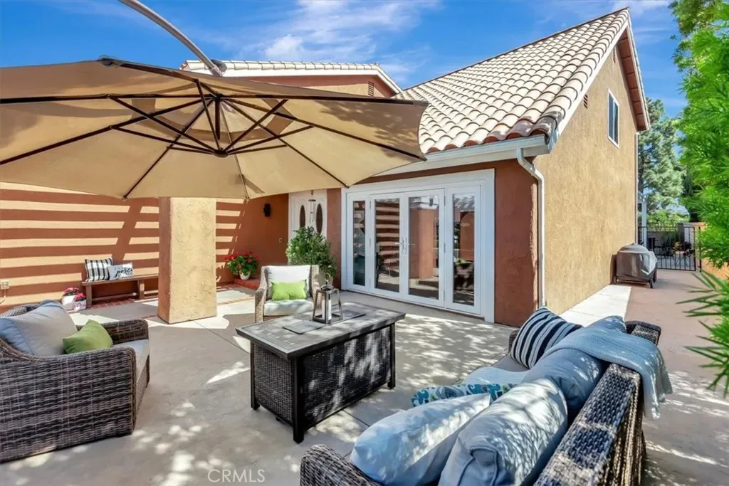 Step outside and the home truly shines. The backyard was designed for entertaining with a remodeled pool and spa with waterfalls, built-in Sunfire gas BBQ, outdoor Sonos sound system with multiple speaker zones, drop-down outdoor television, and Infratech patio heaters that keep gatherings comfortable year-round. The spacious front patio adds even more inviting outdoor living space.