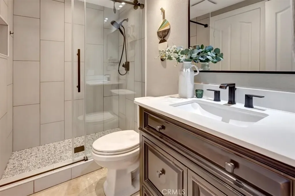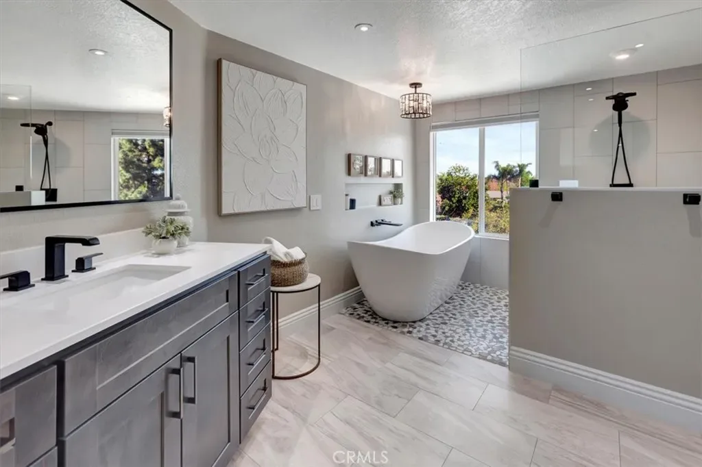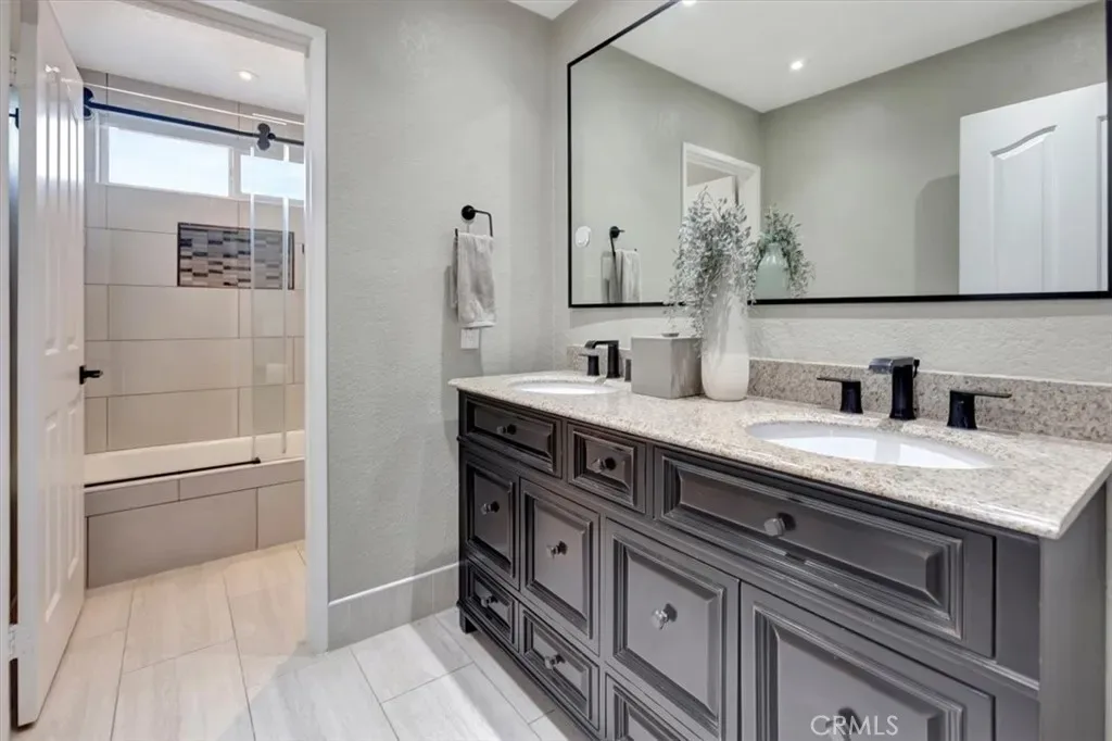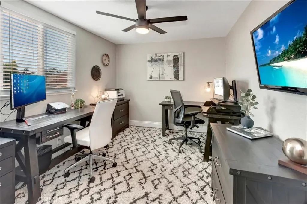 Other interior upgrades include hardwood flooring, upgraded recessed lighting throughout, a remodeled family room with dry bar, and an office with custom built-in cabinetry that can be used as 5th bedroom. The beautifully remodeled primary suite features a walk-in shower with seating bench and a relaxing soaking tub, while the additional bathrooms have been thoughtfully updated. A well-appointed laundry room and closets are enhanced with organization systems and custom storage.