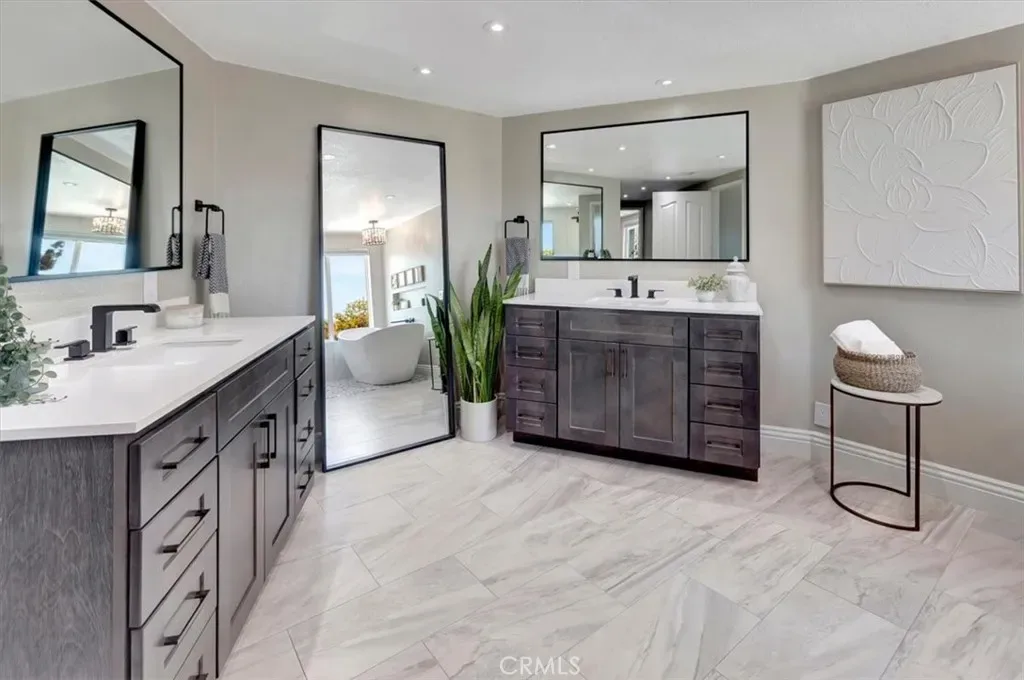 At the heart of the home is a fully remodeled kitchen featuring quartz countertops, custom soft-close cabinetry with pull-out storage, and a premium Thermador appliance package including refrigerator, dishwasher, microwave, double ovens, and built-in coffee system. A reverse osmosis water filtration system completes this impressive space.