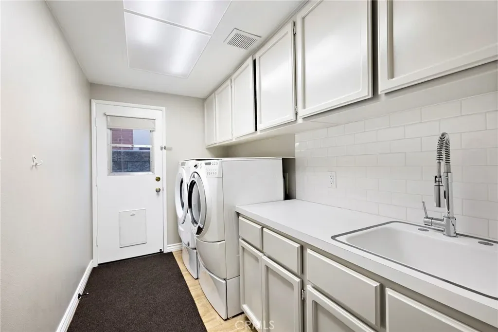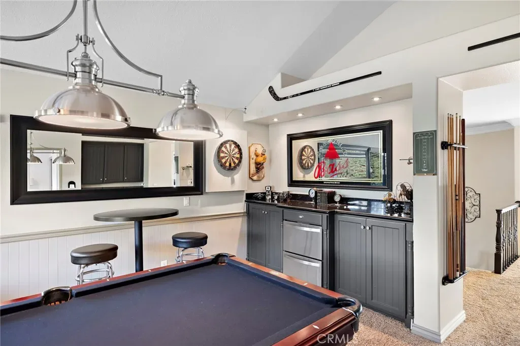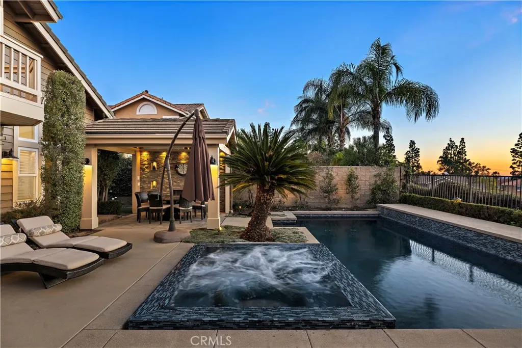 The backyard is a true private resort, featuring a PebbleTec saltwater pool and spa with therapeutic jets, Pentair heating system and variable speed pump. The outdoor kitchen is fully equipped with a 32” Bull BBQ with rotisserie, griddle, dual burners, refrigerator, and sink with hot and cold water. Multiple covered entertaining areas include radiant heaters, a fireplace, and a large gathering structure for year-round enjoyment.