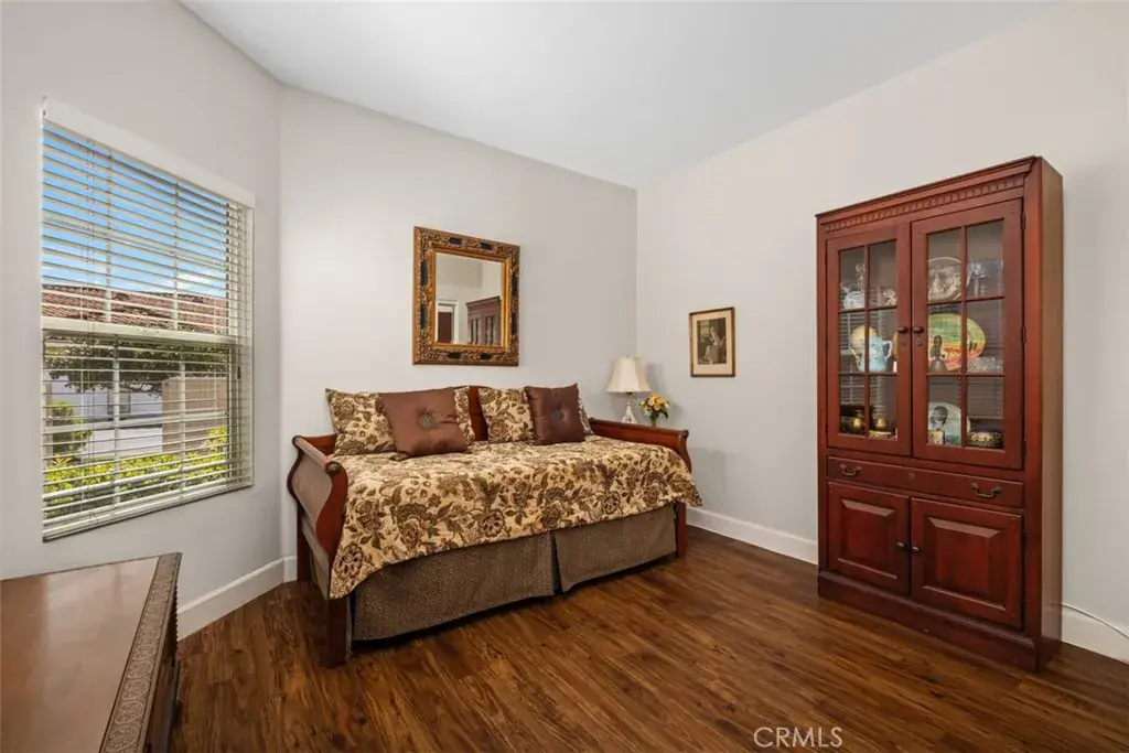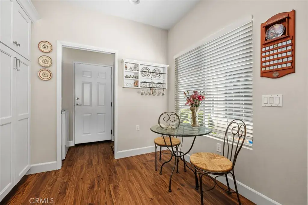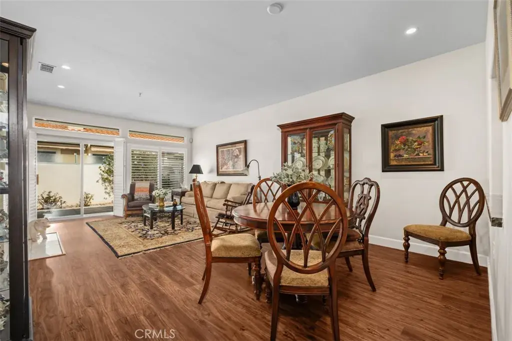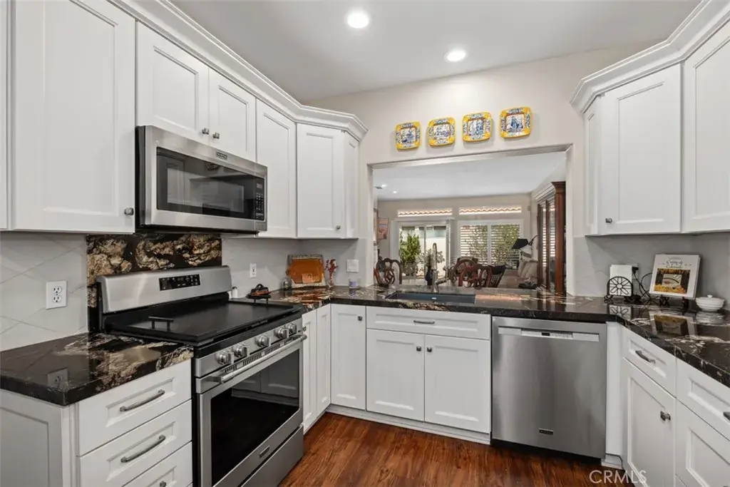 The home features luxury vinyl wood flooring throughout and a totally remodeled kitchen with custom cabinetry, granite countertops, stainless steel appliances, a granite sink, and a charming breakfast nook. From the formal entry, you’ll find a guest bedroom and a remodeled full bathroom. The inviting living room boasts vaulted ceilings, a cozy fireplace, plantation shutters, and direct access to the private back patio, perfectly positioned next to the formal dining area for easy entertaining. The spacious primary suite is located at the rear of the home for added privacy and includes plantation shutters and direct patio access. The remodeled primary bathroom features custom cabinets, with dual sinks and granite counters, a large walk-in shower, a separate water closet, and a generous walk-in closet. Additional highlights include full PEX re-piping and a highly desirable two-car driveway.