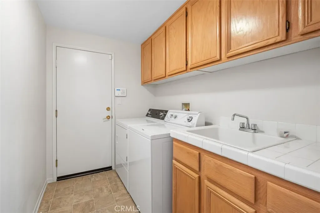 The oversized laundry room offers extensive storage cabinets, a laundry sink, and direct access from the garage. Outside, the low-maintenance backyard is perfect for relaxing or entertaining family and friends.