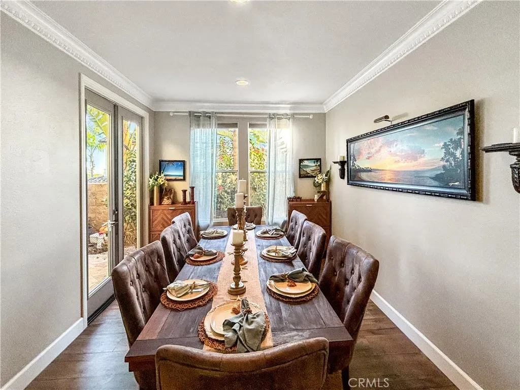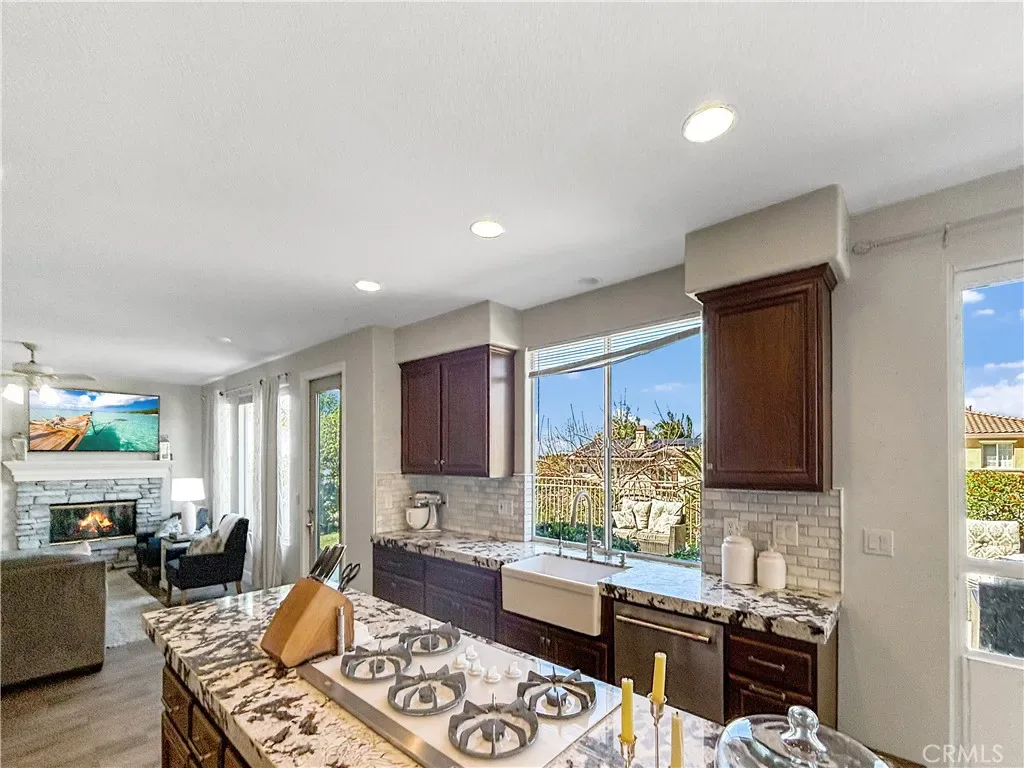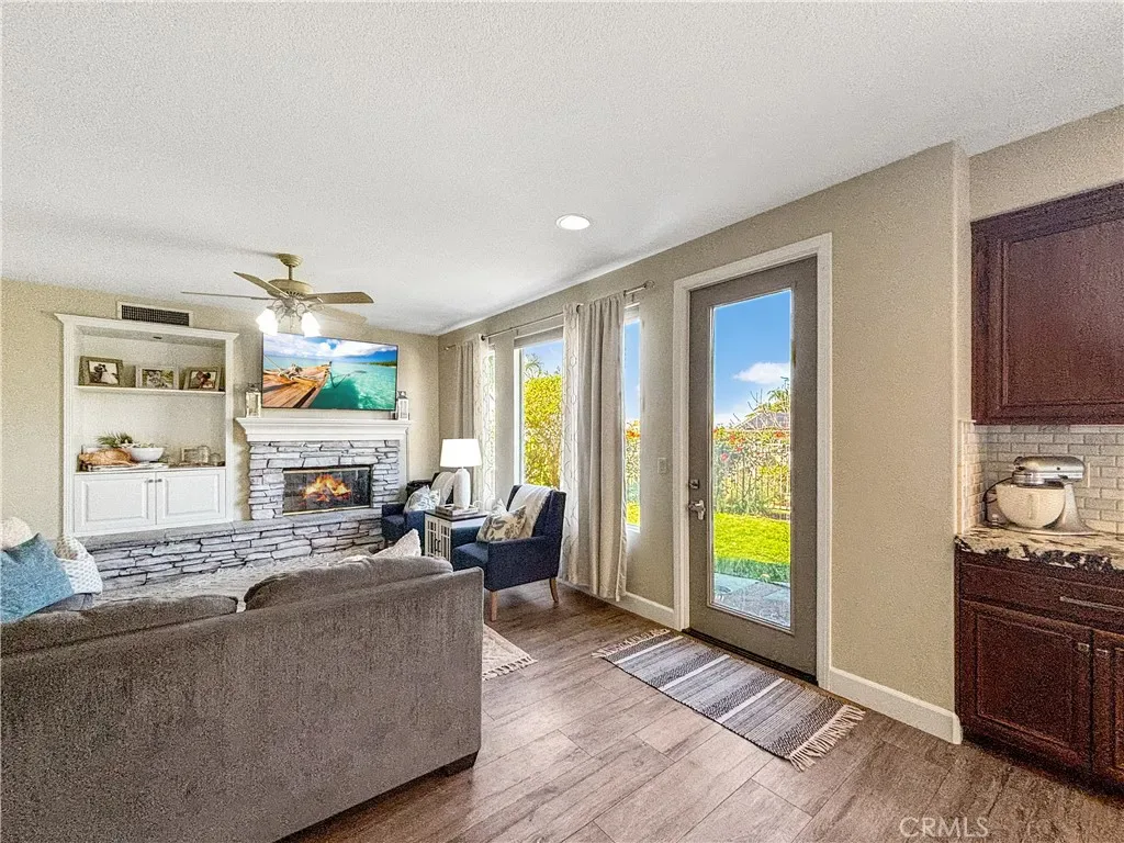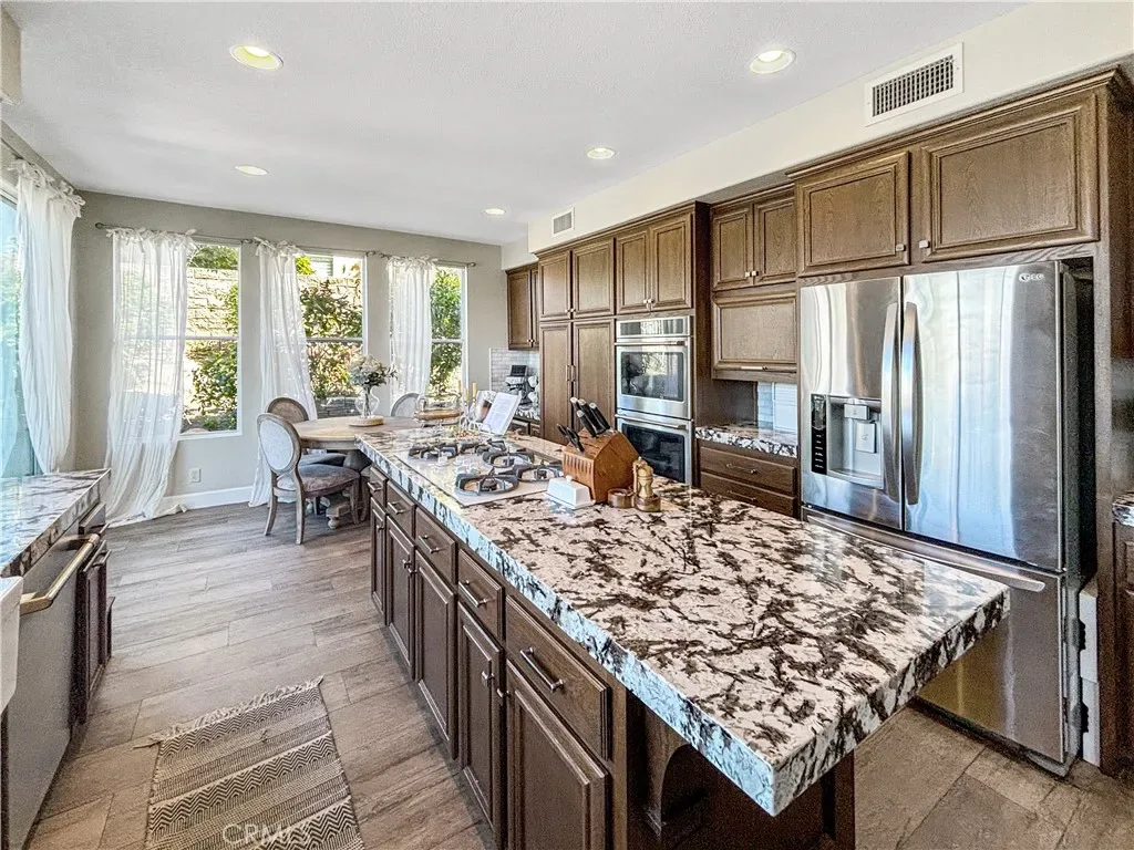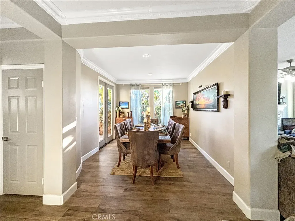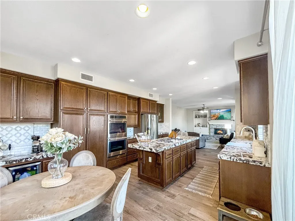 The formal living room flows seamlessly into a dedicated dining area, where French doors open to a private side courtyard—an ideal setting for relaxing or hosting guests. The generously sized kitchen features a breakfast bar, casual dining nook, and built-in workspace, all opening to the comfortable family room complete with a fireplace and custom media center.