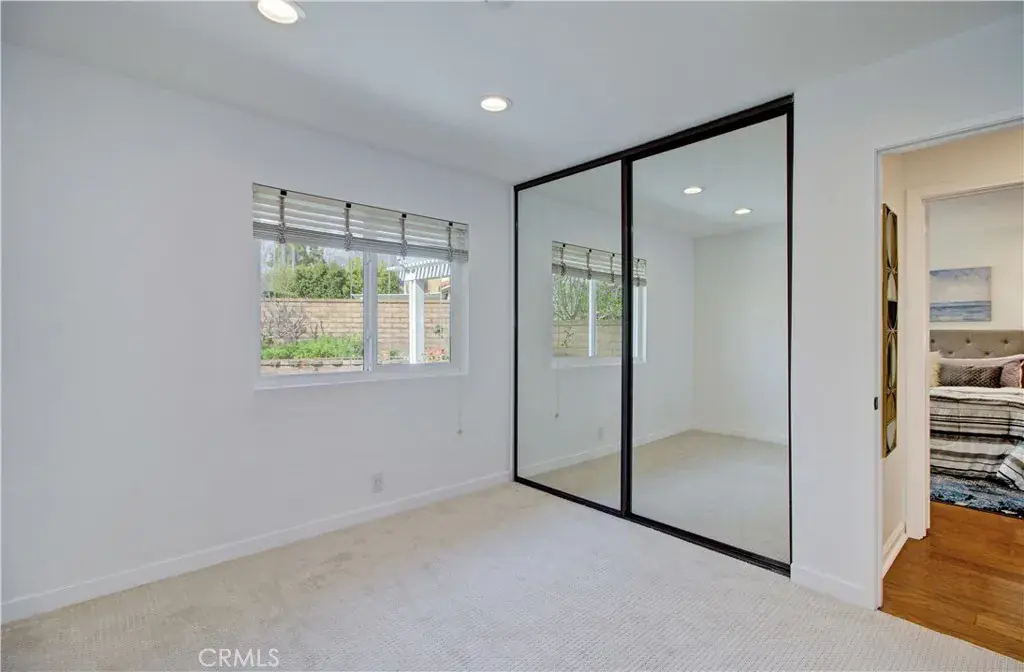 The primary suite includes two closets with mirrored doors and a private en-suite bathroom. Three additional bedrooms feature brand-new carpet and recessed lighting. Updated vinyl windows are found throughout the home, enhancing both comfort and efficiency. The washer and dryer are conveniently located inside the home within a dedicated closet area.