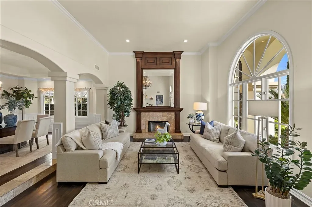 This luxurious Mediterranean estate in the guard gated enclave of Canyon Crest Estates offers an exceptional blend of sophistication and functionality, featuring 5 spacious bedrooms, a dedicated office, and an expansive bonus room—a rare combination that elevates the home’s desirability. From the moment you enter, the home impresses with expansive formal living spaces, soaring vaulted ceilings, and a highly desirable open concept custom floor plan. The newly remodeled gourmet kitchen is a centerpiece of refinement, showcasing quartz countertops, and generous workspace—seamlessly flowing into the casual dining area with new windows and family room that create an ideal inviting great room environment for gatherings. Travertine, and newly installed luxury vinyl plank flooring enrich the interiors with warmth and sophistication. Downstairs, a private office with French doors and main-level bedroom with full bath offer convenience and flexibility for guests or multi-generational living. Upstairs, the expansive primary suite features a private sitting area, fireplace, and balcony overlooking the backyard with scenic views, along with a luxurious bath finished in travertine, glass-enclosed shower and spa-like soaking tub. A spacious bonus room provides additional living space, while the secondary bedrooms include one with an ensuite bath and two others connected by a Jack-and-Jill bathroom. Additional whole home enhancements include owned solar panels, dual whole house fans, new HVAC systems with upgraded ducting and heat pumps, fresh exterior paint, new French doors, and insulated steel garage doors all offering comfort, and enhanced energy efficiency. The resort style backyard is a private sanctuary crafted for exceptional outdoor living. A spectacular pool with baja shelf, rock waterfall, and oversized spa anchors the space, complemented by a cozy fire pit, multiple lounging and conversation areas perfect for both relaxation and entertaining. This extraordinary custom home provides access to Canyon Crest exclusive amenities including multiple tennis courts, three swimming pools, a fitness center, sport courts, a clubhouse, and more. Membership to Lake Mission Viejo opens the door to boating, paddleboarding, community events, and summer concerts—capturing the quintessential Southern California lifestyle. Convenient proximity to premier shopping, top rated schools, and the 5 Freeway and 241 Toll Roads further enhances the appeal of this truly remarkable estate.