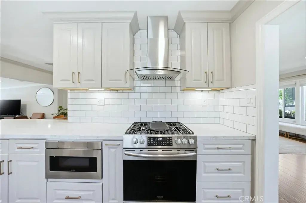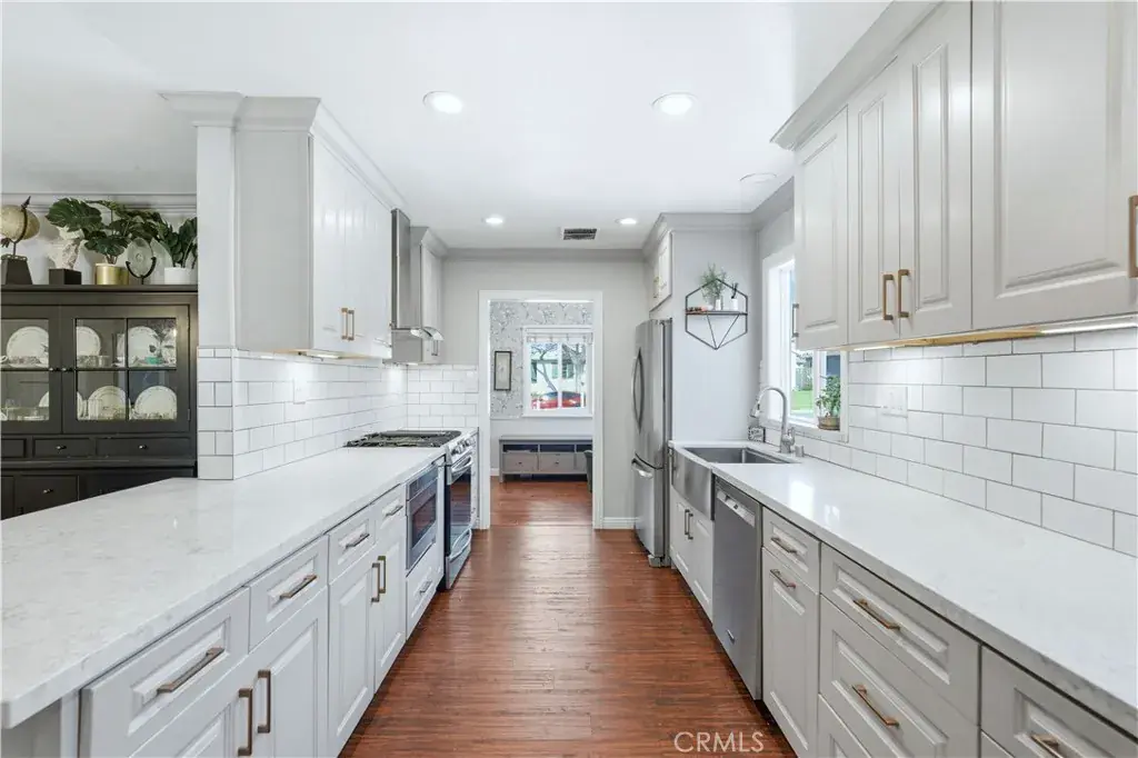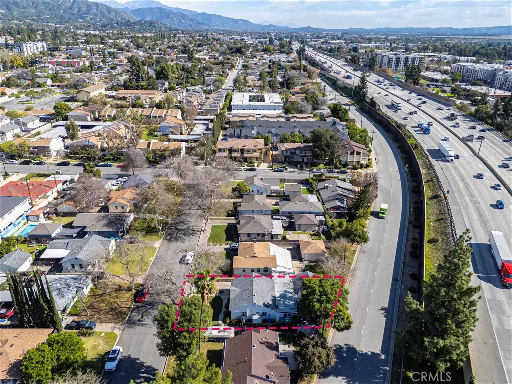 Located on a cul-de-sac street in Monrovia, this single-story property offers approximately 2,187 sq ft of total living space and includes an accessory dwelling unit (ADU). The main residence features three bedrooms and one remodeled full bathroom, along with both a living room and a separate family room. Interior highlights include hard-surface flooring throughout, crown molding, recessed lighting, dual-pane windows, and central air conditioning. The remodeled kitchen is centrally positioned and features white shaker cabinetry, stainless steel appliances, a gas range with vent hood, and a farmhouse-style sink, with easy connection to the dining and living areas. The ADU provides additional living space and includes a private living area with recessed lighting and a full kitchen with white cabinetry, and stainless-steel refrigerator, a separate bedroom, and a ¾ bathroom with walk-in shower and glass enclosure. Finished concrete flooring is featured throughout the ADU. Outdoor features include a covered patio, grass area, storage structure, and an above-ground spa. The long driveway provides multiple parking options, and the lot configuration allows clear separation between the main residence and the ADU. Conveniently located near local streets providing access to Monrovia amenities, parks, dining, and shopping.