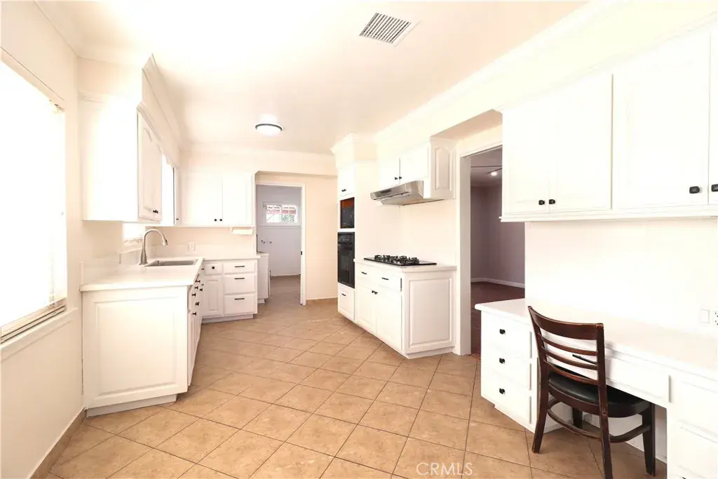 The open dining area flows right into the newly remodeled kitchen, complete with new Quartz countertops, new sink and faucet, cooktop, built-in desk and casual eating area.