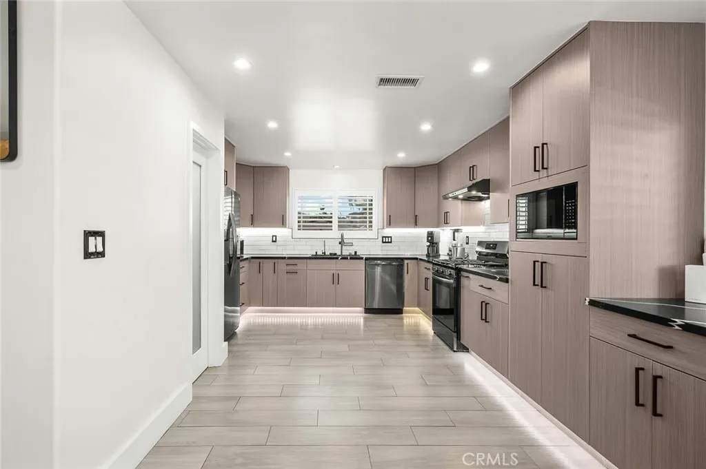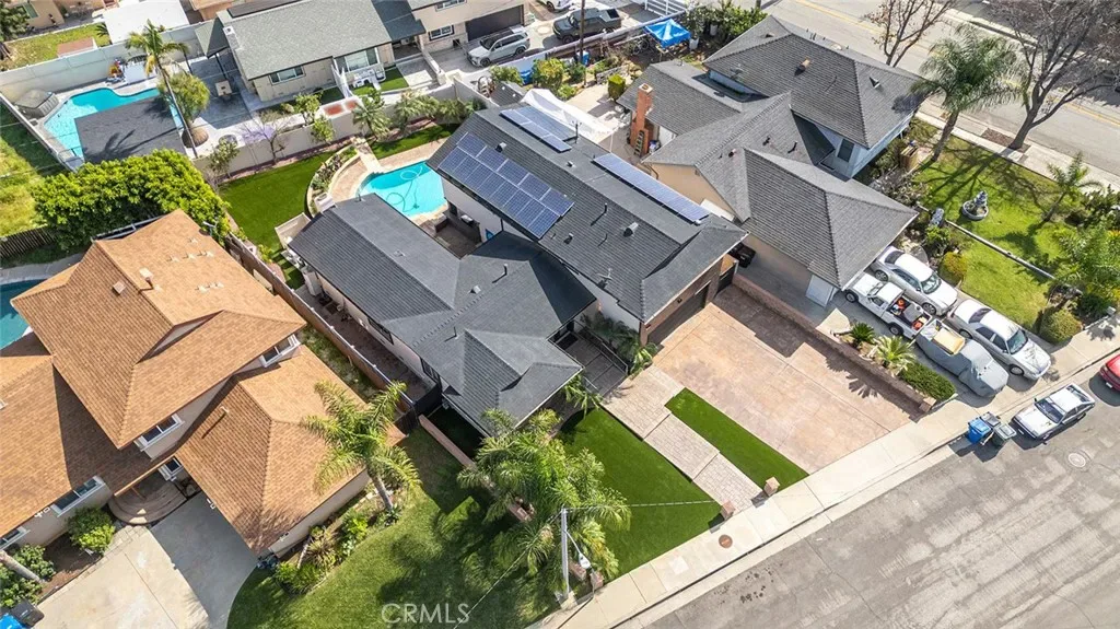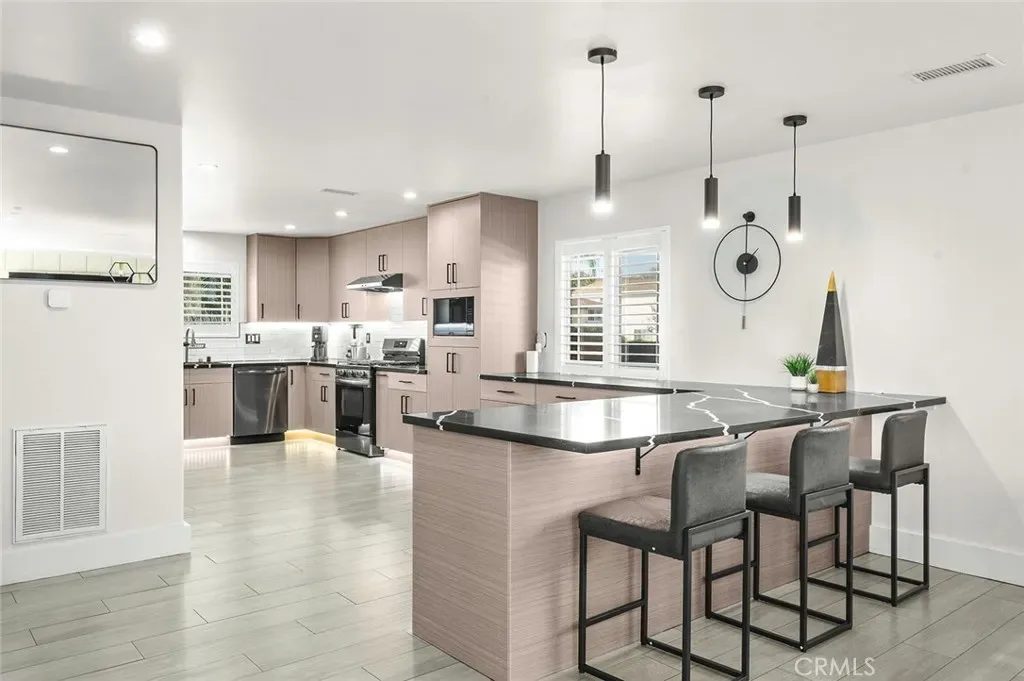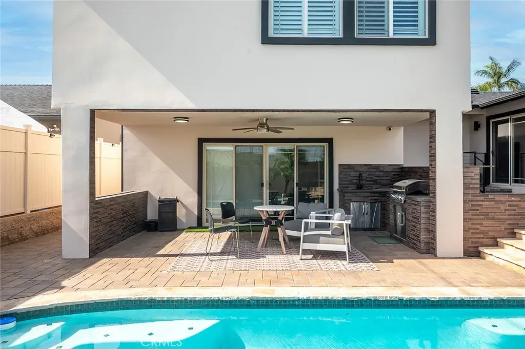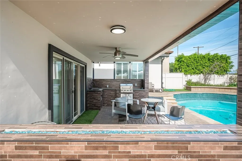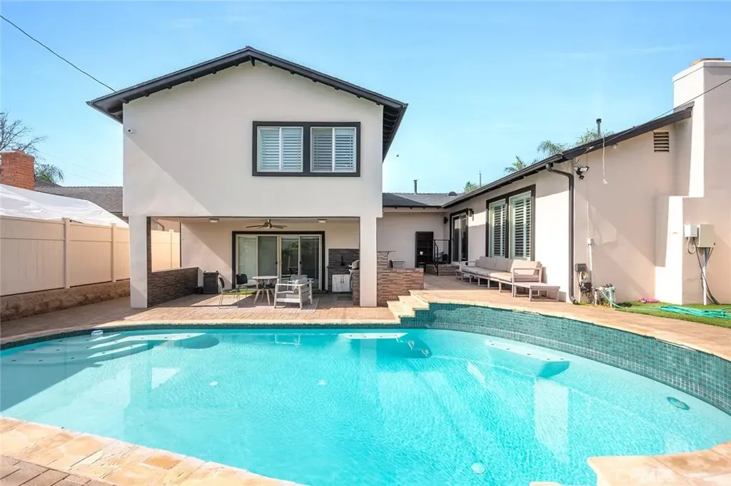 Beautifully upgraded 4-bedroom, 3-bath home offering 2,637 sq ft of modern luxury and thoughtful design. This turnkey property is loaded with high-end features and smart upgrades throughout. Enjoy peace of mind with a full camera system surrounding the home, complete with DVR and remote viewing. A whole-house filtration system (valued at $7,500) adds comfort and quality to everyday living. The interior boasts brand-new kitchen cabinets, striking accent walls with custom finishes, sleek black chrome appliances, and a spacious pantry ideal for storage and organization. Additional highlights include a large coat closet, wet bar, and ultra-soft carpeting. The home features beautifully upgraded bathrooms with digital showers, modern finishes, and updated flooring, along with a stylish new staircase and railing. Fresh interior and exterior paint, LED lighting throughout, and a brand-new tankless water heater enhance both style and efficiency. Step outside to your private backyard retreat featuring a pool with a new pump and finish, built-in BBQ with island, built-in fire wall, and elegant landscape lighting—perfect for entertaining. The custom marble-look garage flooring adds a polished touch. With walk-in closets, smart home features, and premium upgrades at every turn, this home offers the perfect blend of comfort, technology, and style in a highly desirable location.