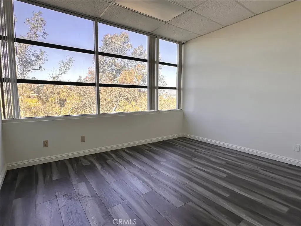 Large windows provide pleasant views and abundant daylight, creating a bright and professional work environment. Vinyl flooring runs throughout, and the space includes a convenient in-suite utility sink.