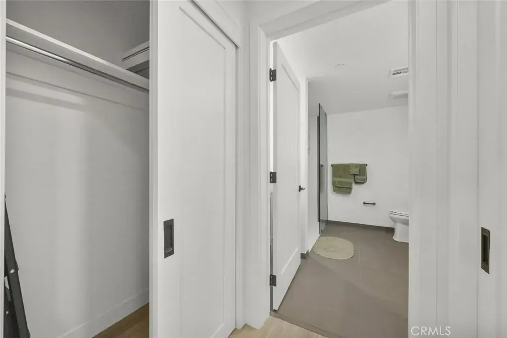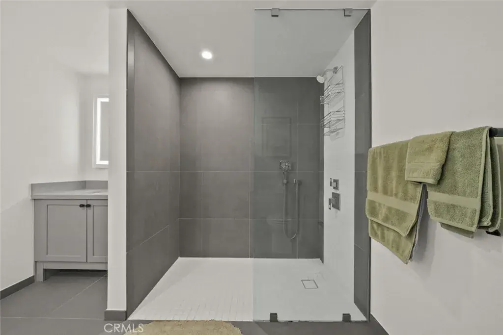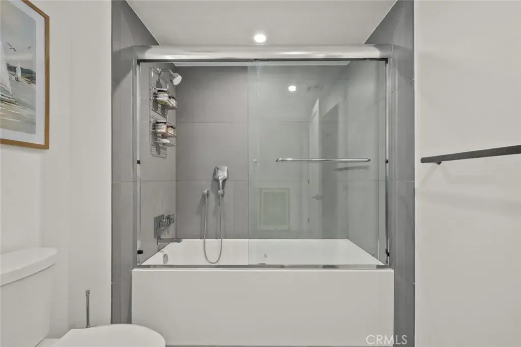 The primary bedroom features ample closet space and an ensuite bathroom with a dual sink vanity and contemporary finishes. The secondary bedroom is well sized and conveniently located near the second full bathroom, which includes a spacious shower and modern design.