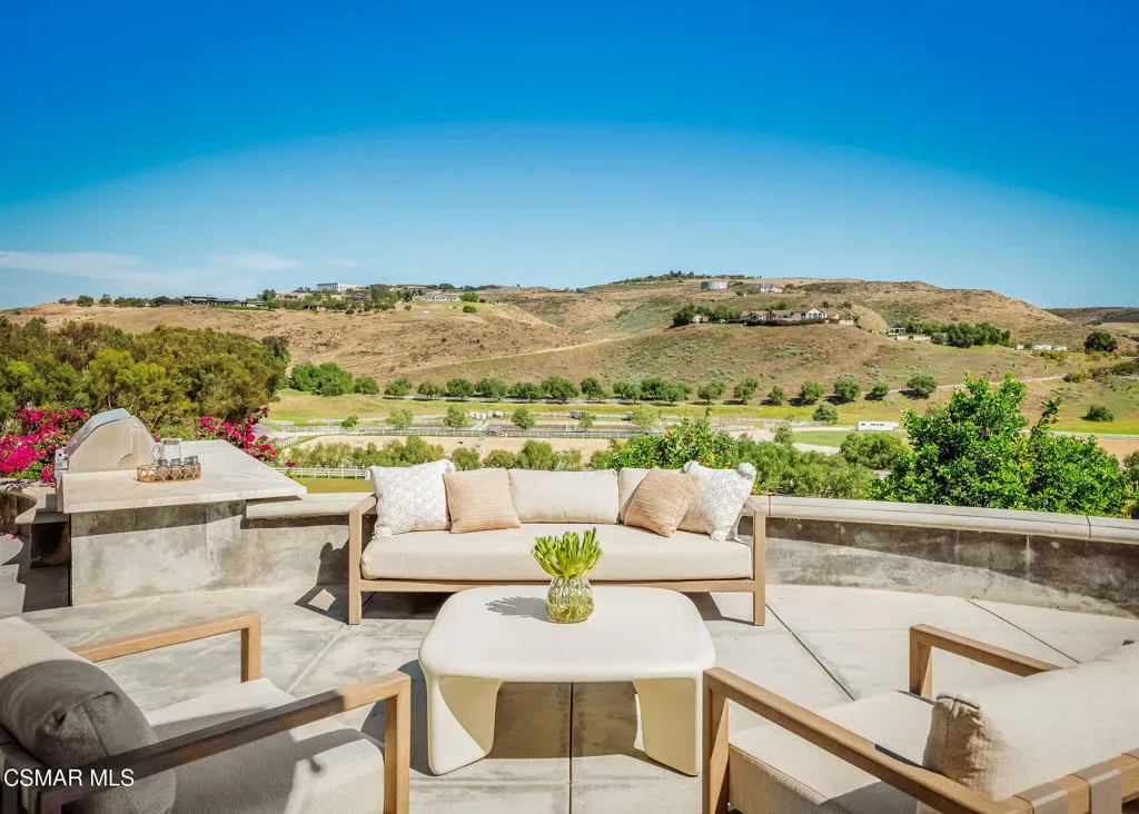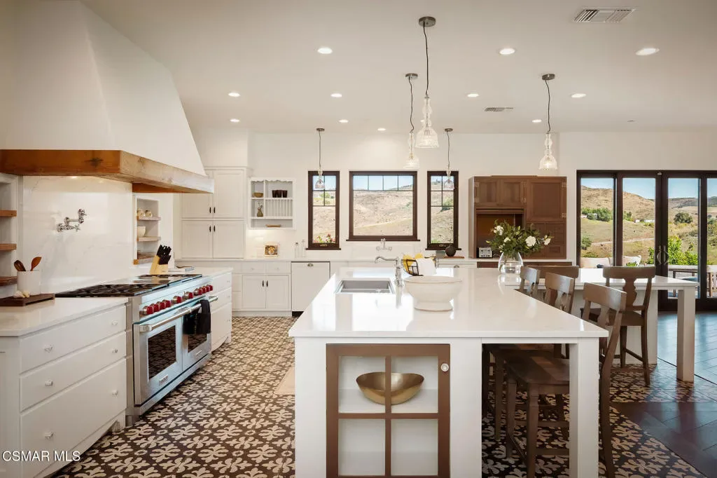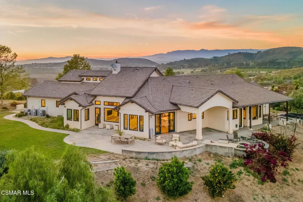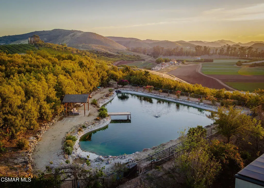 Lapeyre Ranch, an incredible opportunity in Moorpark… and this one is truly something special. Set across 10 acres of rolling, usable land, 15645 Lapeyre Road offers a rare and compelling blend of modern farmhouse living, income producing agriculture and fully realized equestrian amenities; all framed by sweeping views and endless open sky.Privately positioned at the top of the property, the newly refreshed 4,937 square foot residence captures breathtaking panoramic vistas from nearly every angle. Designed in a warm, modern farmhouse aesthetic, the home features expansive open concept living spaces, wide plank wood floors and beautiful exposed beams that create both volume and intimacy. The heart of the home is a stunning chef’s kitchen, complete with a large center island, custom cabinetry, statement range and sunlit breakfast area. All seamlessly connected to the main living and dining spaces for effortless entertaining.Walls of windows and doors open to an inviting outdoor setting, where a built in BBQ, firepit lounge, and multiple seating areas overlook the surrounding orchards, barn and distant hills; creating the ultimate indoor/outdoor lifestyle.With 8 bedrooms and 3.5 baths, the home offers incredible flexibility for extended family, guests or a live/work dynamic.Beyond the residence, the property unfolds into a truly special ranch environment. Approximately 1,600 flourishing avocado trees and 425 Tango tangerine trees provide meaningful income potential, while the equestrian facilities are both functional and thoughtfully designed. A classic red barn with oversized stalls and corrals sits alongside a large riding arena, ideal for recreational riding. In addition, a substantial 40′ x 60′ detached shop/garage provides exceptional space for equipment, vehicles, storage, or all of your ranch needs–an incredibly valuable and versatile addition to the property.A private swimming pond with dock adds a rare and tranquil element, offering a peaceful retreat and a true connection to the land. Gently sloping acreage, mature landscaping and wide open space create a setting that feels both expansive and serene.This is a privately gated property where lifestyle, land and opportunity come together seamlessly. Whether you’re seeking a working ranch, an equestrian retreat or a private estate with income producing potential….15645 Lapeyre Road is more than a home… it’s a destination.