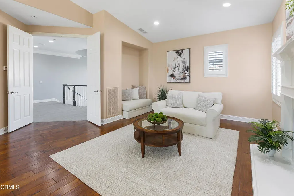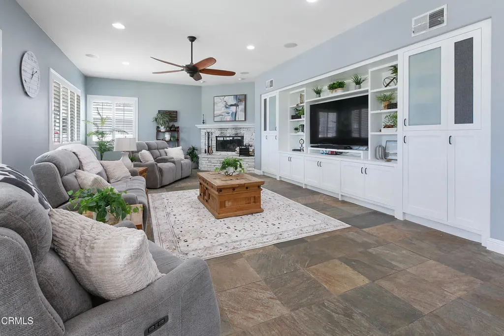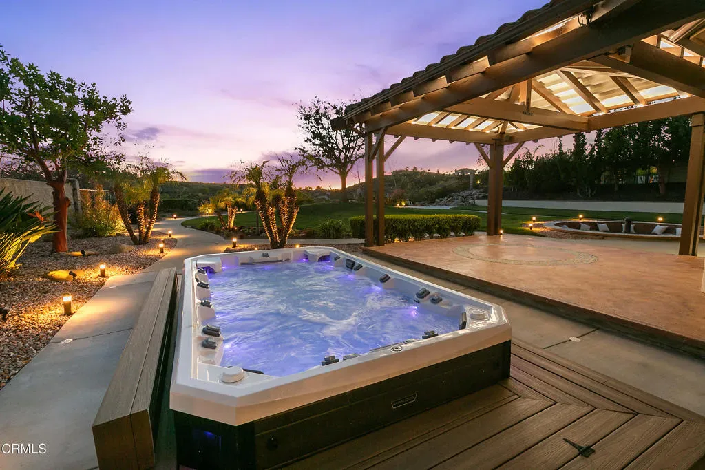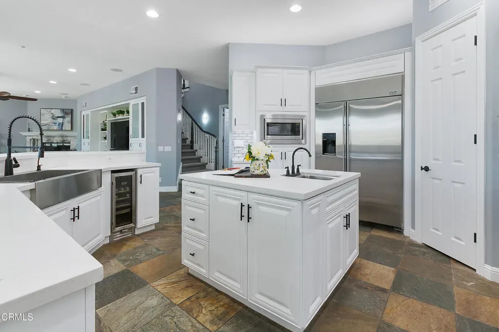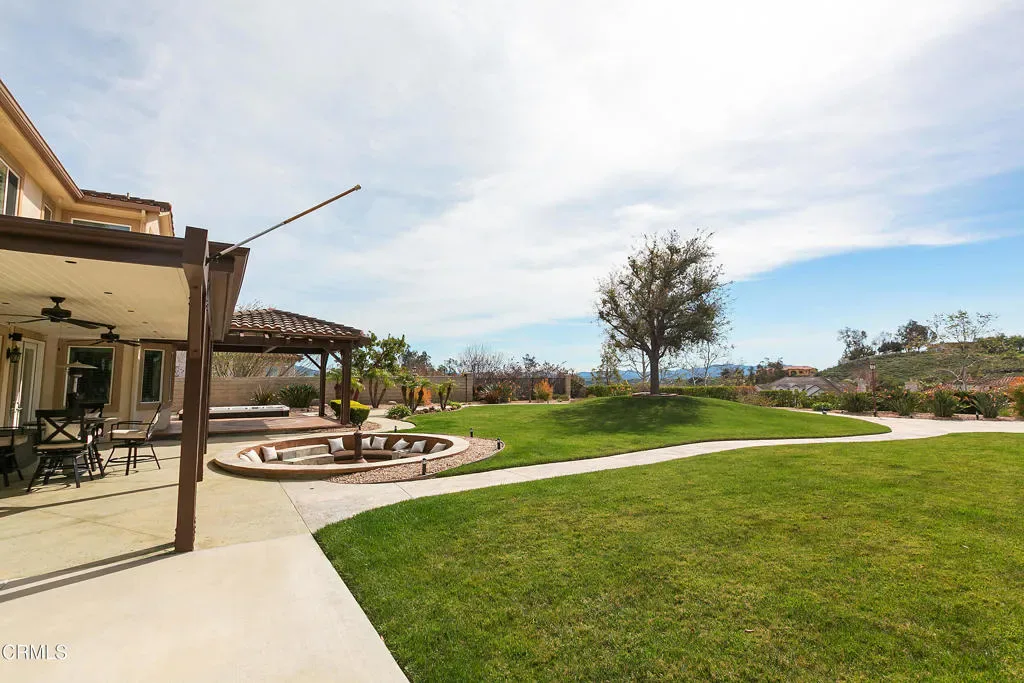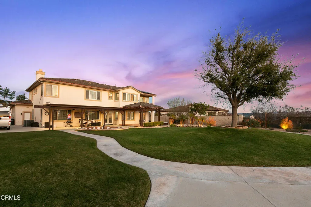 Nestled in the foothills of Moorpark Country Club within the prestigious gated community of Moorpark Country Club Estates, seamlessly combines elegance, comfort, and resort-style living. Breathtaking mountain views and overlooking a scenic 27-hole championship golf course, this beautifully remodeled, move-in-ready home offers the ultimate in luxury and lifestyle. Step into an impressive foyer highlighted by soaring ceilings and a sweeping staircase that sets the tone for the home’s refined design. The formal living and dining rooms are perfectly scaled for intimate gatherings and are enhanced by picturesque yard views that create a warm and inviting atmosphere. Adjacent to a charming breakfast nook and spacious breakfast bar, the fully remodeled kitchen showcases sleek quartz countertops, modern custom cabinetry, high-end appliances, abundant counter space, and designer finishes throughout. Thoughtfully designed for both functionality and style, the kitchen opens seamlessly to the family room, complete with beautifully crafted built-in entertainment and bar cabinetry, creating an ideal setting for both everyday living and entertaining. The flexible floor plan features a convenient downstairs bedroom with en-suite bath, ideal for guests or multigenerational living. A secondary staircase provides convenient access to the upper level, where three additional bedrooms each offer private en-suite baths, along with a luxurious junior suite and an impressive primary suite featuring expansive windows that flood the space with natural light. With five spacious bedrooms and five and one-half remodeled bathrooms, comfort and sophistication are evident at every turn. Resort-inspired outdoor living elevates this property to another level, featuring a sparkling in-ground swim spa, expansive 15-person fire pit, newly poured driveway with RV parking, and an electric vehicle hookup. There is ample space to add a sport court or full-sized pool. Solar and a whole-home generator provides added peace of mind, and the garage includes custom built-in cabinetry for exceptional storage. Fresh interior paint, plantation shutters, fully remodeled bathrooms, and curated designer touches throughout complete this exceptional offering.