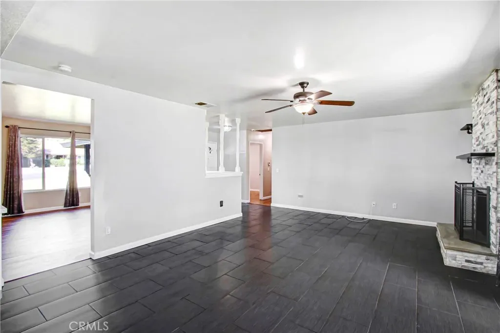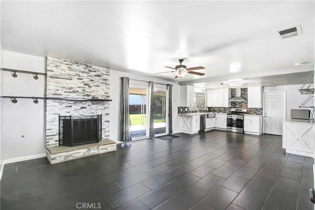 Step inside to find a thoughtfully updated interior featuring brand new luxury vinyl plank flooring in the dining area and durable wood-like tile flooring throughout the family room and kitchen. The remodeled kitchen is a true centerpiece, showcasing sleek quartz countertops, a custom tile backsplash, and ample space for cooking and gathering. The inviting family room is highlighted by a stunning fireplace with ledger stone accents, creating a warm and stylish atmosphere.