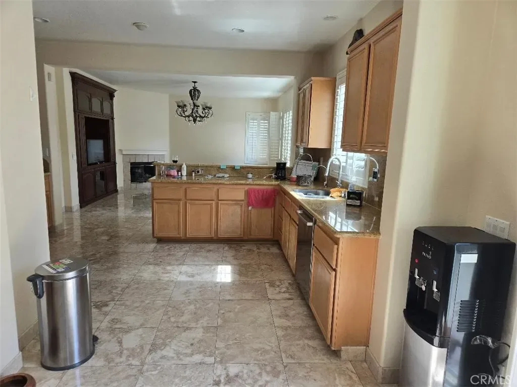 House has living room with chandeliers and a family room w/fireplace and built in cabinet.