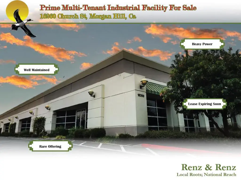 Discover a truly unique industrial opportunity at 16260 Church St, Morgan Hill, Ca. This quality multi-tenant industrial facility is positioned for strategic use and income for decades to come. The property was originally designed with the ability to operate as 4 separate units but is currently 3 self-sustained units. USERS & INVESTORS With Sempera Organics lease expiring in May 2026 owner/users can occupy approx. half of the building. Investors can also see significant upside in lease up opportunities at significantly higher rents than currently realized. LOCATION SUMMARY Morgan Hill is a vibrant city in Santa Clara County located in South Silicon Valley, just 10 miles south of San Jose. Morgan Hills ideal location offers residents and visitors a vibrant Downtown, year-round outdoor recreational activities, including cycling, golfing, swimming, and boating.