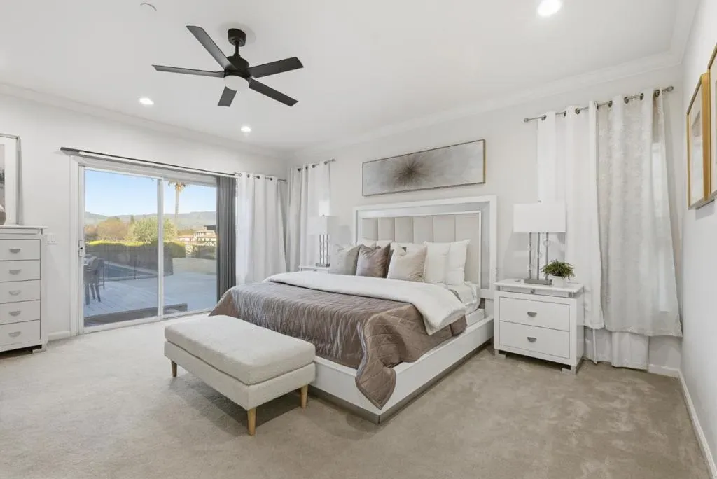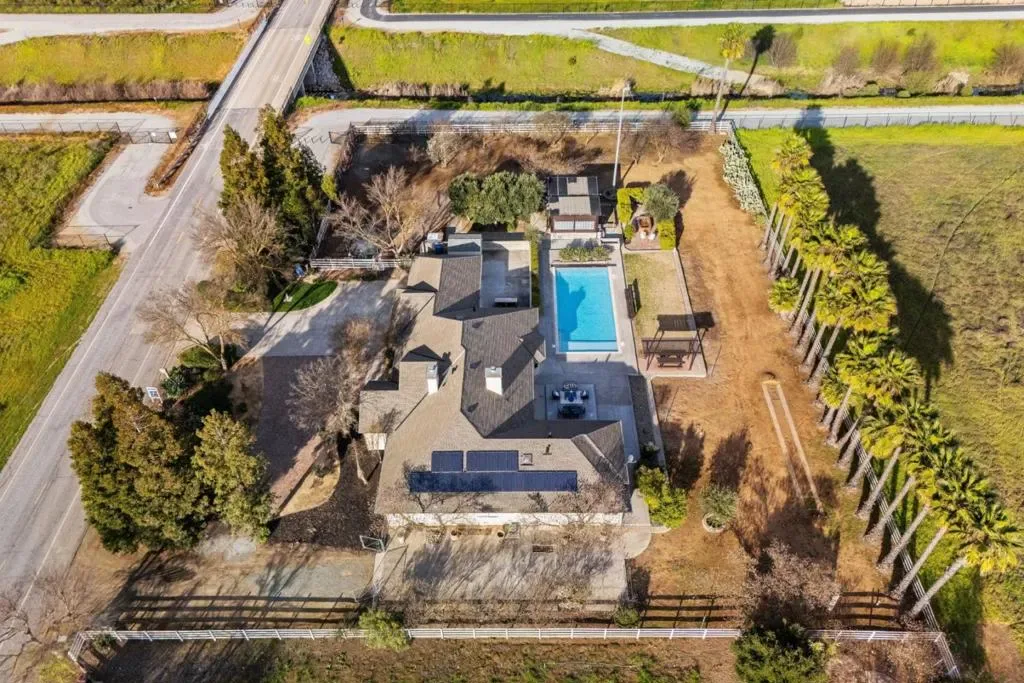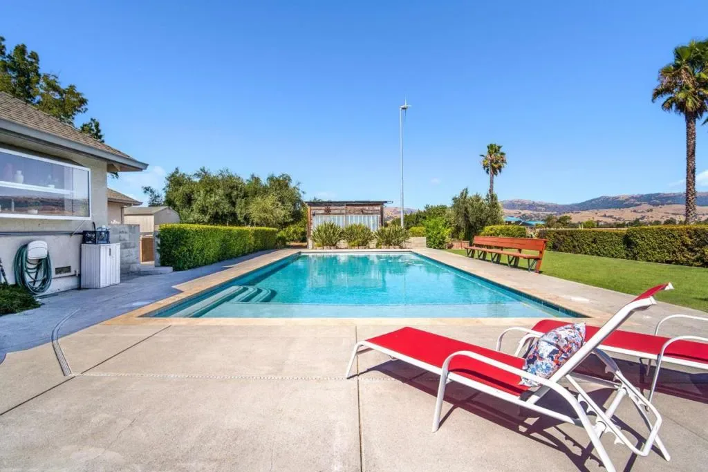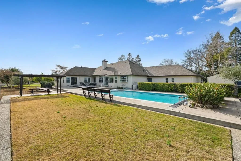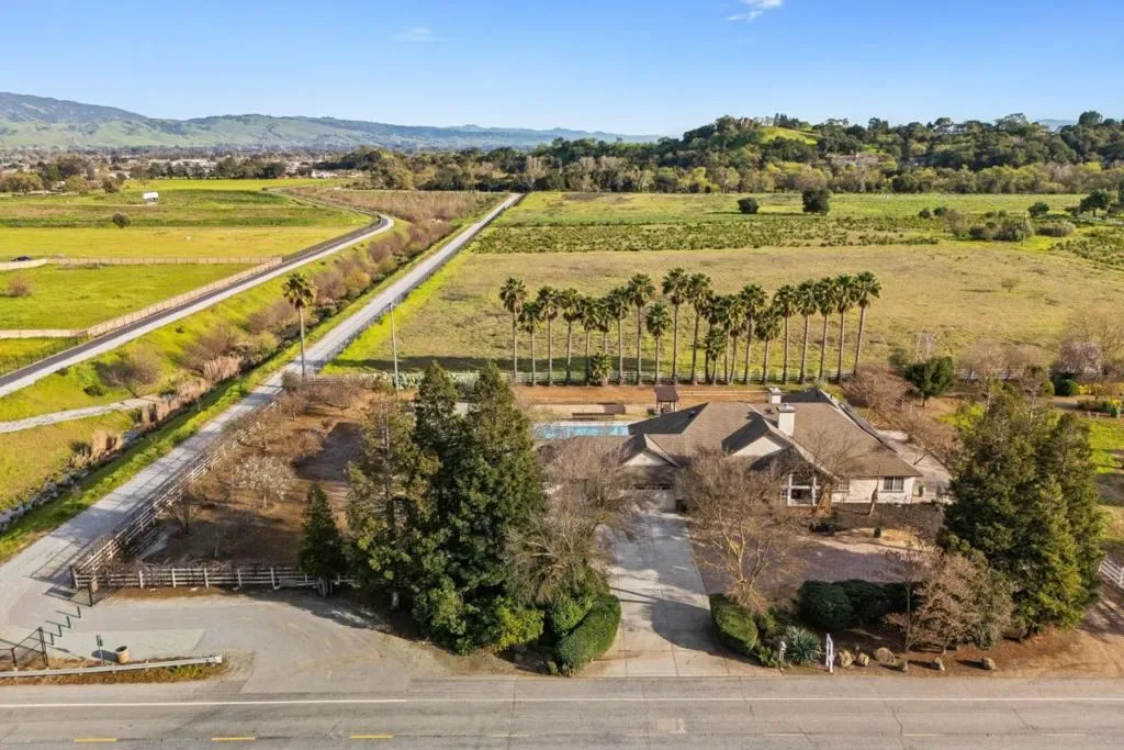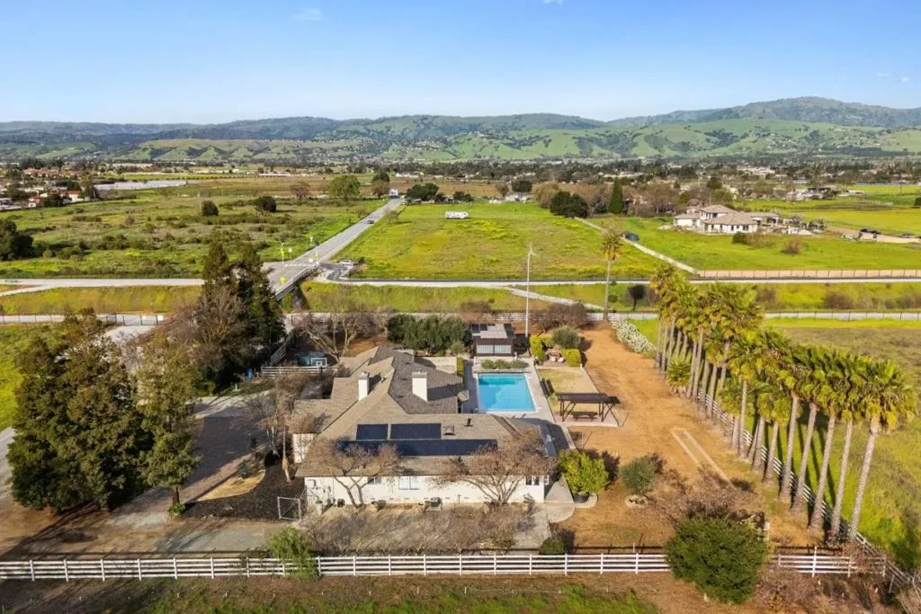Gorgeous Single Story Morgan Hill Estate, ideal location minutes from vibrant MH downtown, 1+ flat Acre with beautiful swimming pool. The well-designed open floor plan provides generous living space and features a cathedral ceiling in the living room, bringing an abundance of natural light. The property includes a spacious paver horseshoe driveway plus additional concrete parking, ideal for oversized vehicles or ADU, enjoy newer flooring and fresh interior and exterior paint. kitchen has been updated with newly painted cabinets and newer stainless-steel appliances. The primary suite offers a cozy gas fireplace and a small lounge area, perfect for relaxing. The 3 car garage features epoxy-coated concrete flooring and workshop. Large Inside Laundry Room, Fire sprinklers, Storage Shed, Green House, Sprinkler System, Turbine Windmill, Solar panels- SunRun Company. Beautiful Outdoors, the pool has been recently re-plastered and includes a newer motor system, Orchard field, Horseshoe Pit, BBQ Area, Patio Deck, Water Tank for Fire Use. Ideal private location near walking trails, Highway 101, and close proximity to downtown Morgan Hill, known for its great restaurants, shopping, and family-friendly seasonal events.