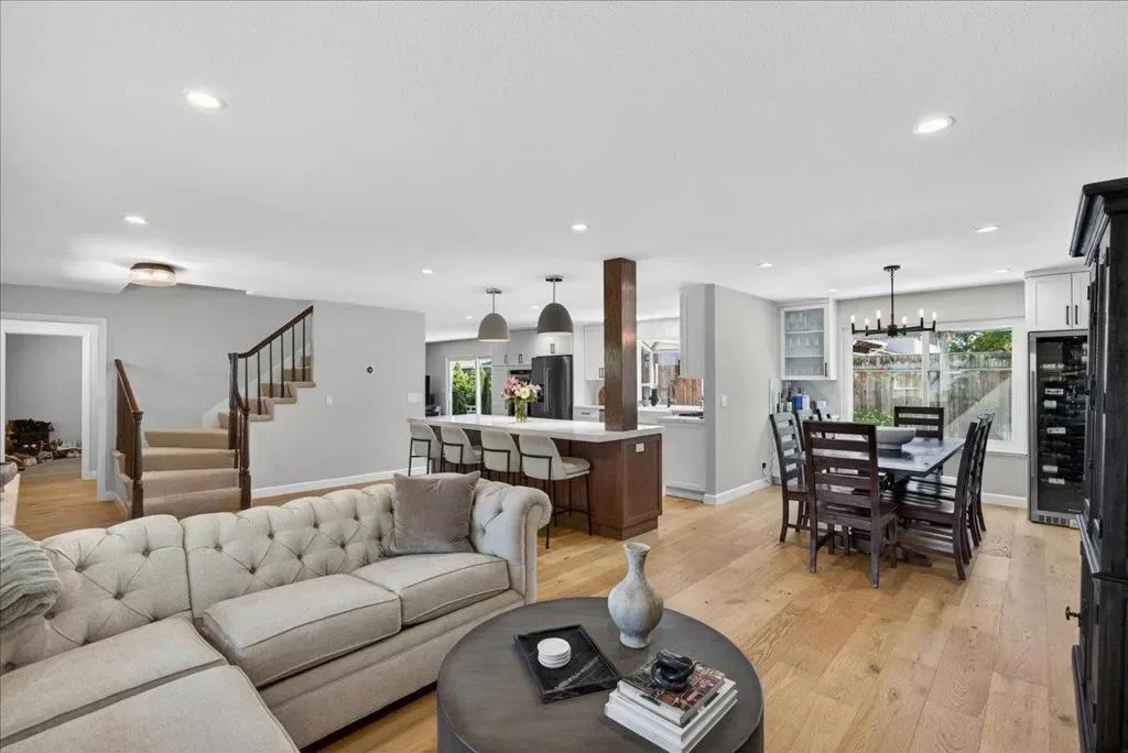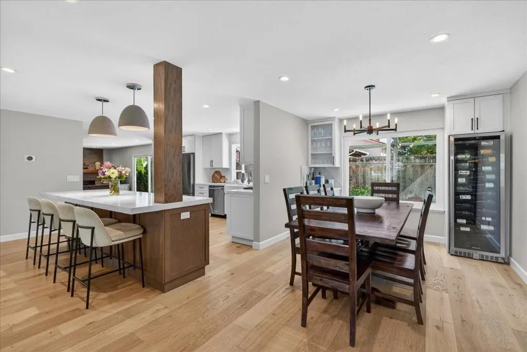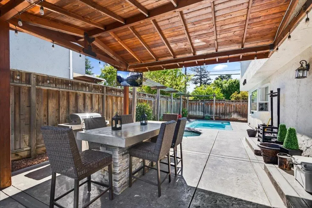 This beautiful home in Morgan Hill’s sought-after Paradise neighborhood offers the ideal blend of style, comfort, and indoor-outdoor living. With over $200K in recent remodeling, a light-filled interior showcases wire-brushed European white oak flooring throughout the main level, recessed lighting, and a seamless layout. Separate formal living and dining areas are complemented by an inviting family room with a sleek 36-inch Redstone electric fireplace and slider door to the back. The chef’s kitchen features Cygnet Drift quartz countertops with full-height backsplash, white shaker cabinetry, a farmhouse sink, and premium KitchenAid appliances including double ovens and a gas cooktop. An oversized, statement-making island with bar seating anchors the space. A main-level bedroom and full bath offer flexibility for guests or multi-generational living. Upstairs, the spacious primary suite includes a walk-in closet, mountain views, and an updated bath, while three additional bedrooms share a hall bath. The backyard is designed for entertaining with a pool, spa, pergola, outdoor TV, built-in island, and fire pit. Additional highlights include dual-zone HVAC, dual-pane windows, indoor laundry, and a 2-car garage. Ideally located near parks, downtown, and desirable Morgan Hill schools.