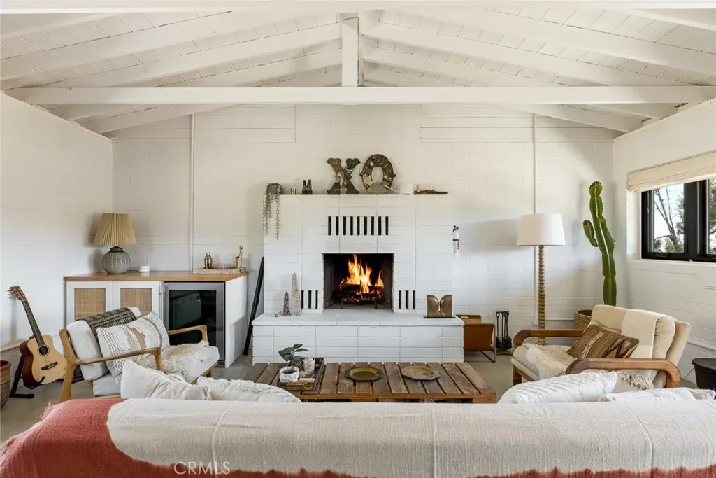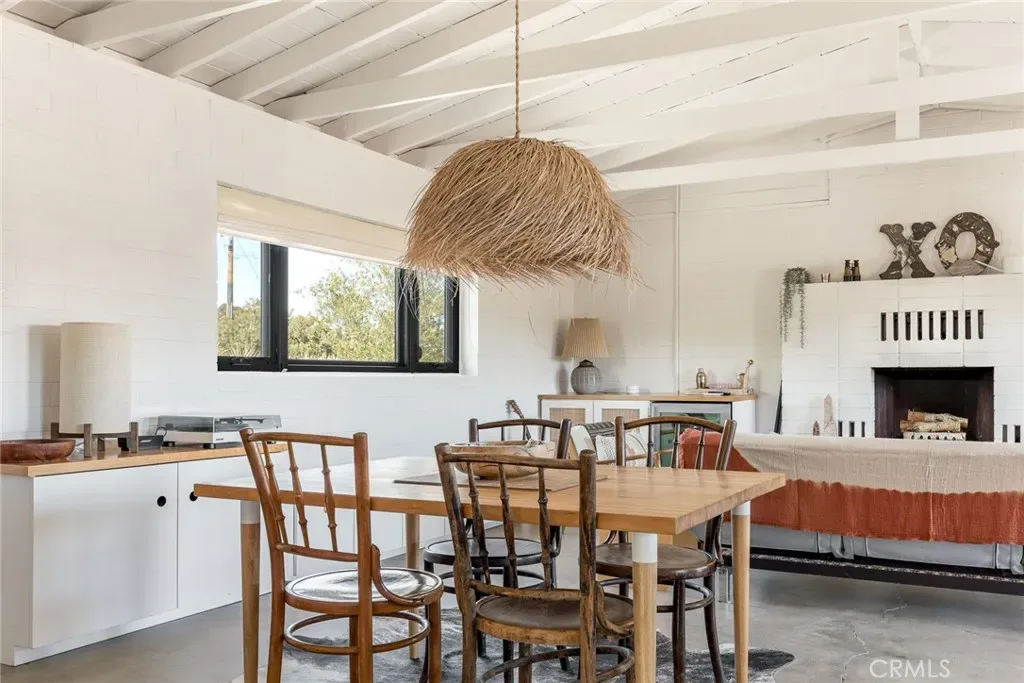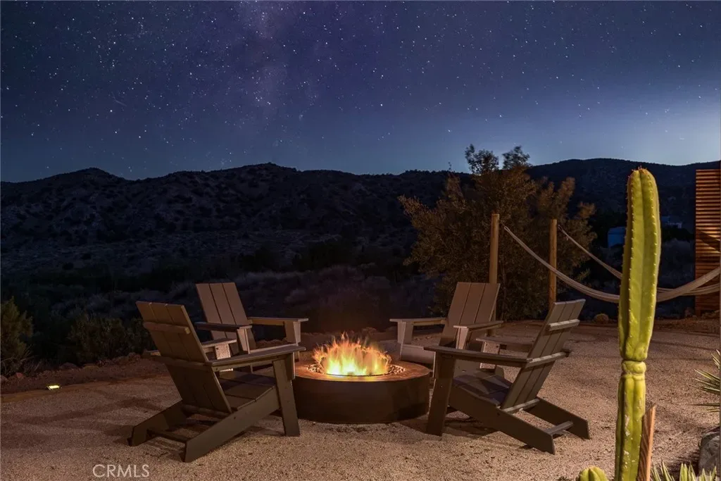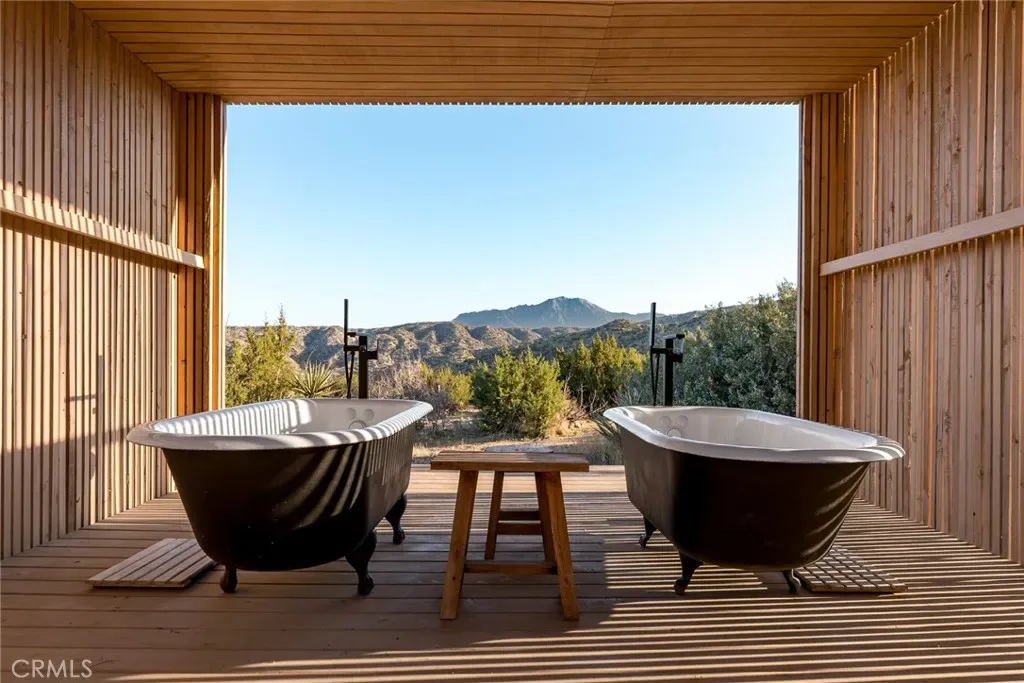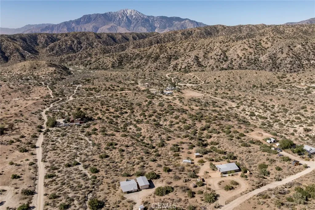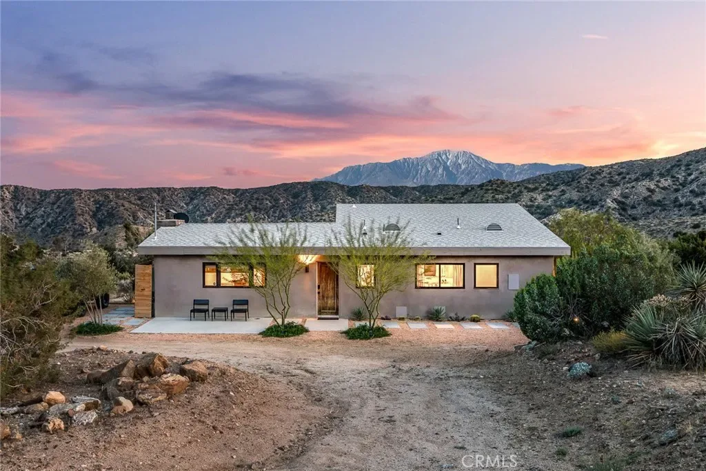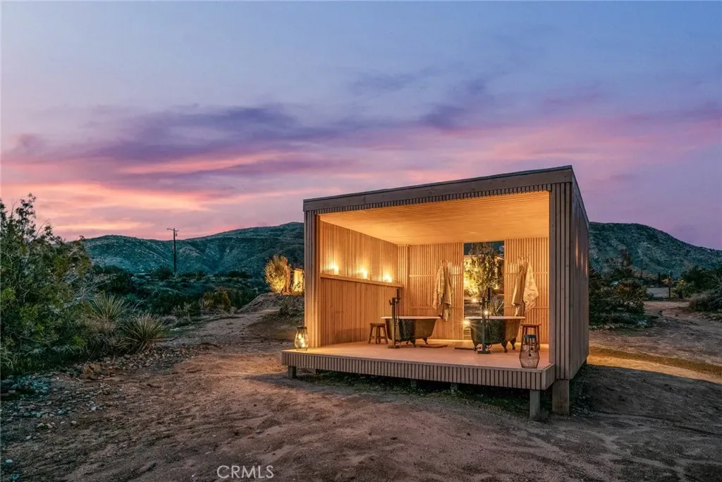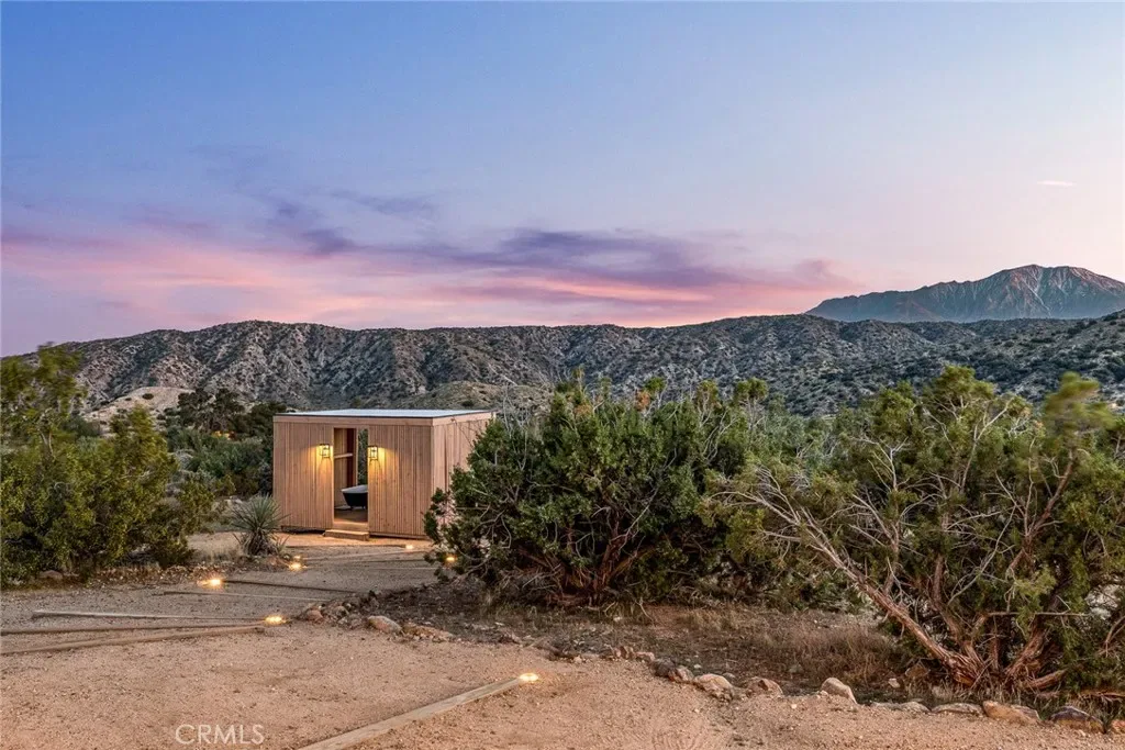 Dramatic mountain views envelop you from all directions in this artist-designed mid-century retreat spanning 5 serene acres under the majestic backdrop of Mt San Jacinto. The original 1959 brick cabin serves as an open concept living & dining area with soaring exposed beam ceilings, a cozy wood burning fireplace, built-ins, and a modern kitchen complete with quartz countertops, new copper plumbing, and a clever hidden under-counter fridge. A thoughtfully curated 2022 renovation introduces a chic new primary bedroom, oversized bathroom, bonus sleeping loft, and mini splits for climate control. The generously sized bedroom features a walk-in closet and built-in office nook, punctuated by a wall of glass sliders inviting you to take in the striking outdoor panorama. Down the hall you’ll find a hidden stackable washer & dryer and a spa-like bathroom with venetian plaster, dual sinks, a soaking tub, a shower room, and a separate water closet. A ladder opens to a secret upstairs 300 sq ft sleeping loft with more impressive views, making a delightful guest bunk or a quirky clubhouse for the kids. A 384 sq ft covered outdoor patio spans the rear of the home, leading to an open-air lounge and dining area with a gas grill, propane fire pit, and built-in hammocks to unwind under the stars. Follow the professionally landscaped path down to the most instagrammable moment of them all – a bespoke wooden bathhouse where 2 vintage clawfoot tubs beckon you to enjoy a hot soak framed by yet another incredible view. Ideally situated less than 2 hours to LA, 15 minutes to Palm Springs, 20 minutes to Joshua Tree National Park, and surrounded by 154,000 acres of publicly accessible canyons, preserves, white waters, trails, and mountain peaks of the Sand to Snow National Monument, this property is the perfect home-base for everything from romantic getaways to family adventures. Sold turnkey so you can grab your suitcase and move right in, or take over the “guest favorite” airbnb account to start generating short term rental income right away. An original 1968 Silver Streak trailer and adjacent buildable 5 acre parcel are available to purchase separately to create your own 10-acre multi-parcel dream compound.