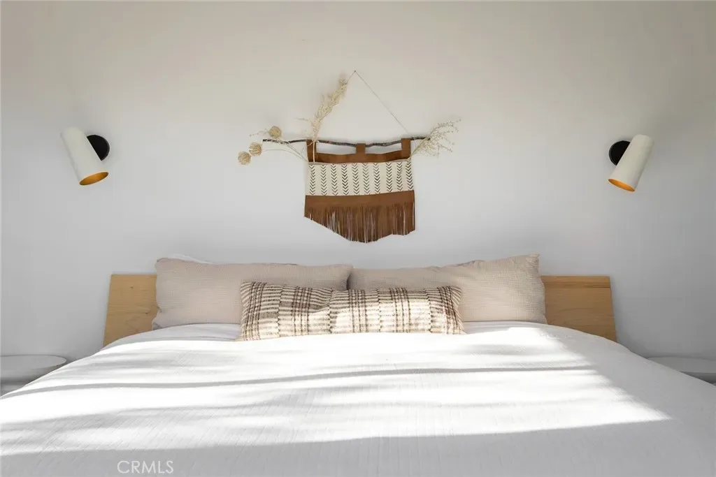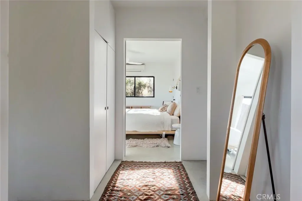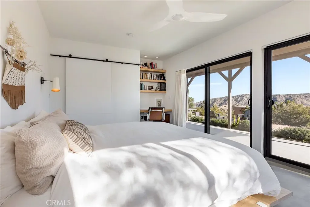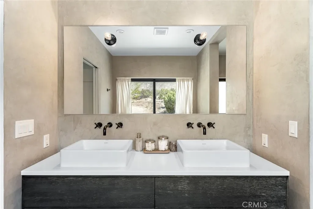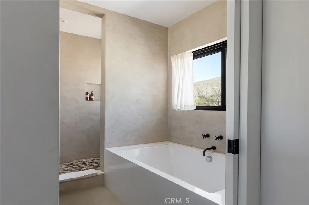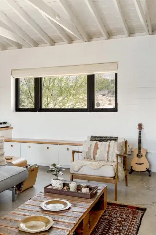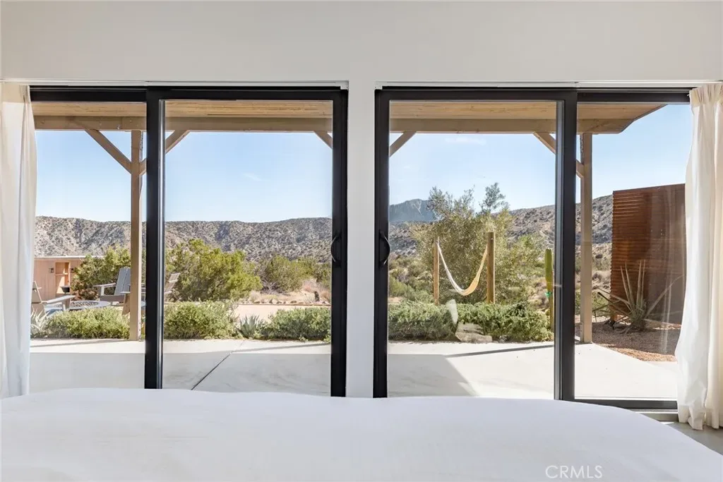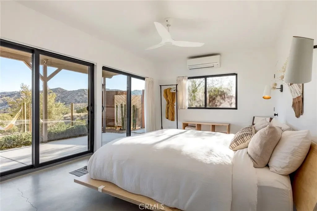 Dramatic mountain views envelop you from all directions in this artist-designed mid-century retreat spanning 5 serene acres under the majestic backdrop of Mt San Jacinto. The original 1959 brick cabin serves as an open concept living & dining area with soaring exposed beam ceilings, a cozy wood burning fireplace, built-ins, and a modern kitchen complete with quartz countertops, new copper plumbing, and a clever hidden under-counter fridge. A thoughtfully curated 2022 renovation introduces a chic new primary bedroom, oversized bathroom, bonus sleeping loft, and mini splits for climate control. The generously sized bedroom features a walk-in closet and built-in office nook, punctuated by a wall of glass sliders inviting you to take in the striking outdoor panorama. Down the hall you’ll find a hidden stackable washer & dryer and a spa-like bathroom with venetian plaster, dual sinks, a soaking tub, a shower room, and a separate water closet. A ladder opens to a secret upstairs 300 sq ft sleeping loft with more impressive views, making a delightful guest bunk or a quirky clubhouse for the kids. A 384 sq ft covered outdoor patio spans the rear of the home, leading to an open-air lounge and dining area with a gas grill, propane fire pit, and built-in hammocks to unwind under the stars. Follow the professionally landscaped path down to the most instagrammable moment of them all – a bespoke wooden bathhouse where 2 vintage clawfoot tubs beckon you to enjoy a hot soak framed by yet another incredible view. Ideally situated less than 2 hours to LA, 15 minutes to Palm Springs, 20 minutes to Joshua Tree National Park, and surrounded by 154,000 acres of publicly accessible canyons, preserves, white waters, trails, and mountain peaks of the Sand to Snow National Monument, this property is the perfect home-base for everything from romantic getaways to family adventures. Sold turnkey so you can grab your suitcase and move right in, or take over the “guest favorite” airbnb account to start generating short term rental income right away. An original 1968 Silver Streak trailer and adjacent buildable 5 acre parcel are available to purchase separately to create your own 10-acre multi-parcel dream compound.