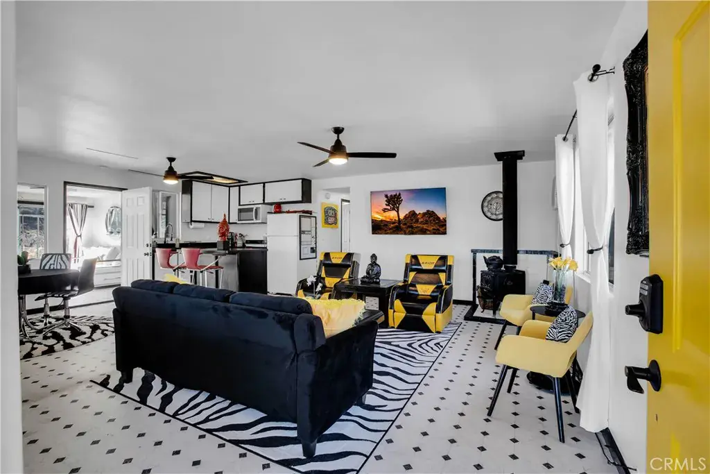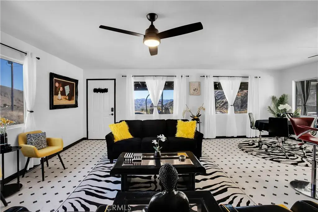 Discover a unique mid-century Western-style retreat on 5 private acres in scenic Morongo Valley, just 2 miles into Big Morongo Canyon. Perched atop a hill at the end of a solar-lit drive, this renovated home offers modern upgrades throughout. Expansive windows and sliders frame sweeping mountain views, while an open floor plan flows into a bright sunroom, library/office, bedroom, and a full bath. A 600 sq. ft. covered veranda provides stunning vistas by day and city lights by night. The wine frig is ready for you to keep a solid supply, so you are ready with a glass of wine for the sunset. The 1,500 sq. ft. warehouse/workshop is ideal for RVs, art studio, dirt toys, storage, or multiple vehicles. Enjoy solar-lit trails, a gazebo, fire pit, and tranquil streamside views. Just minutes from Joshua Tree and Palm Springs, and approx. 2 hours from L.A. Private showings only—please do not go to property without an agent.