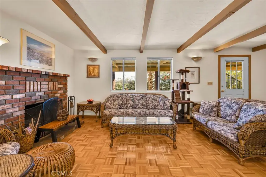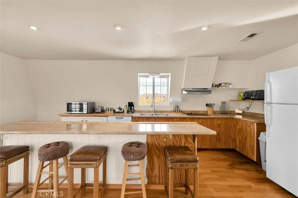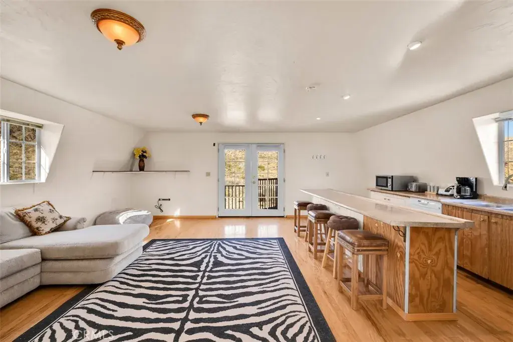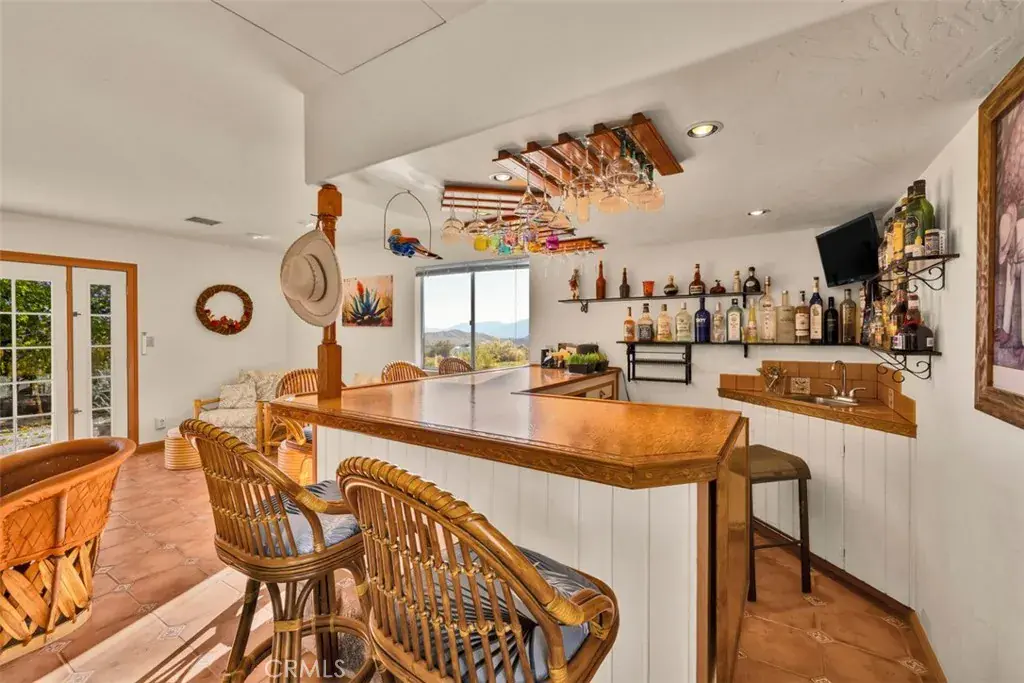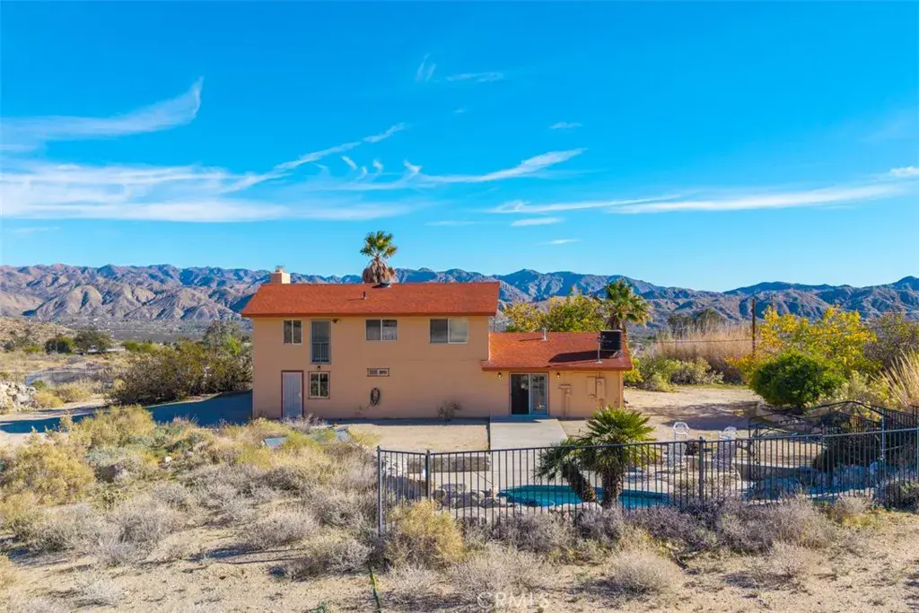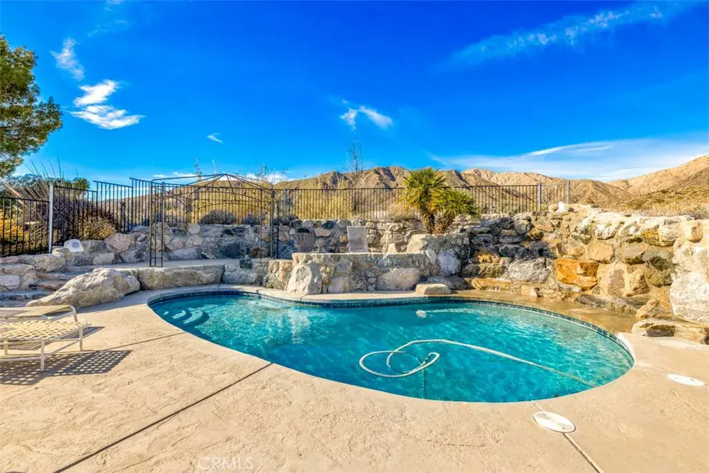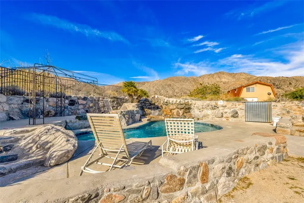 The first floor features a living room with a wood-burning fireplace, a kitchen with beautiful birch cabinets and a full bath, and a bedroom. An oversized south-facing family room with a built-in bar flows seamlessly to the outdoors through a sliding glass door, leading to your private pool area — a true desert oasis. The rock waterfall cascading into the pool was thoughtfully crafted using stones from the land itself.