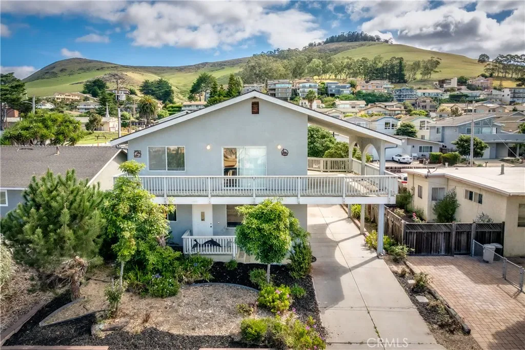 Is it finally time to make that beach home dream a reality? Unique opportunity in North Morro Bay – this versatile 1,666 sq ft property is ideal as a beach retreat, income-producing investment, or BOTH. The upstairs unit offers 2 bedrooms and 2 baths, vaulted ceilings, an open living/dining/kitchen flow including a sweeping wraparound side/front balcony, perfect for outdoor living with peek-a-boo white cap ocean waves and sunset views; the primary suite includes mirrored closets and a private bath with dual sinks and a walk-in shower. The additional upstairs bedroom is spacious and shares the guest bath which offers dual sinks and shower / tub combo. Downstairs features a separate 1-bedroom, 1-bath apartment with kitchenette and private entrance—perfect for rental income, guests, or multi-gen living—while interior stairs connect both levels to a 2-car garage, laundry and extra storage or living space that could serve as a fourth bedroom. Practical highlights include dual access from Fir St. and Greenwood, ample covered parking, yard area, and plenty of street parking. With its flexible floorplan and proximity to the sand, this North Morro Bay home is a rare find—schedule a showing to see its potential now.