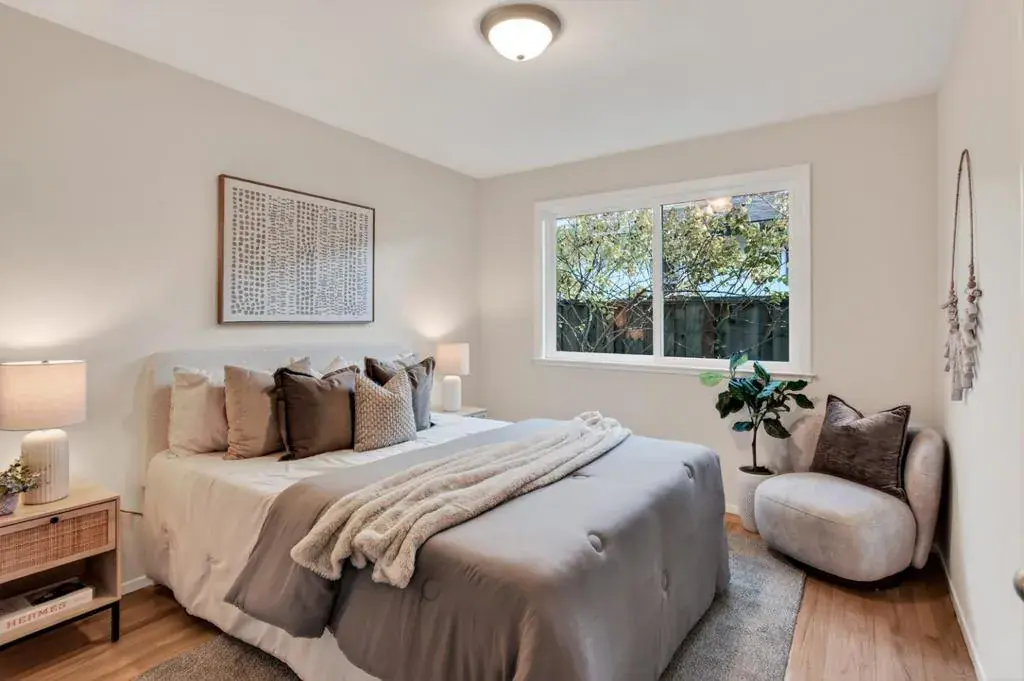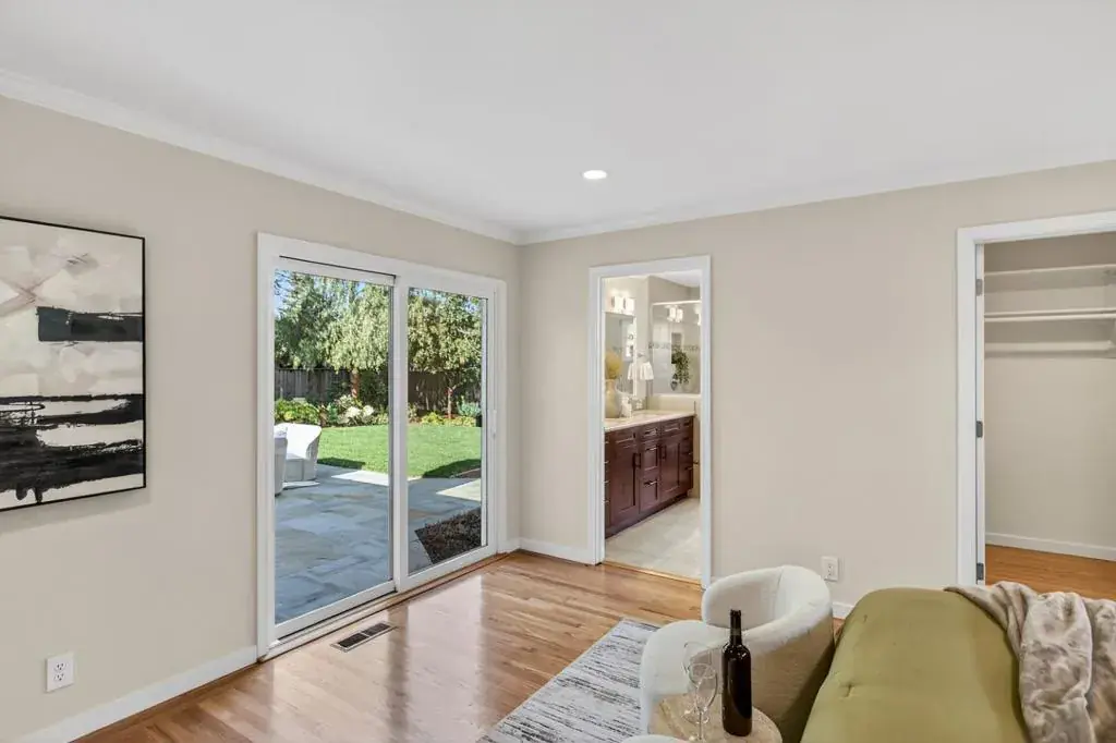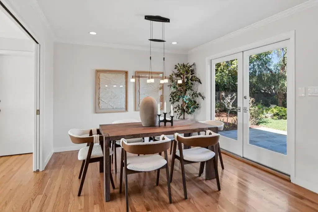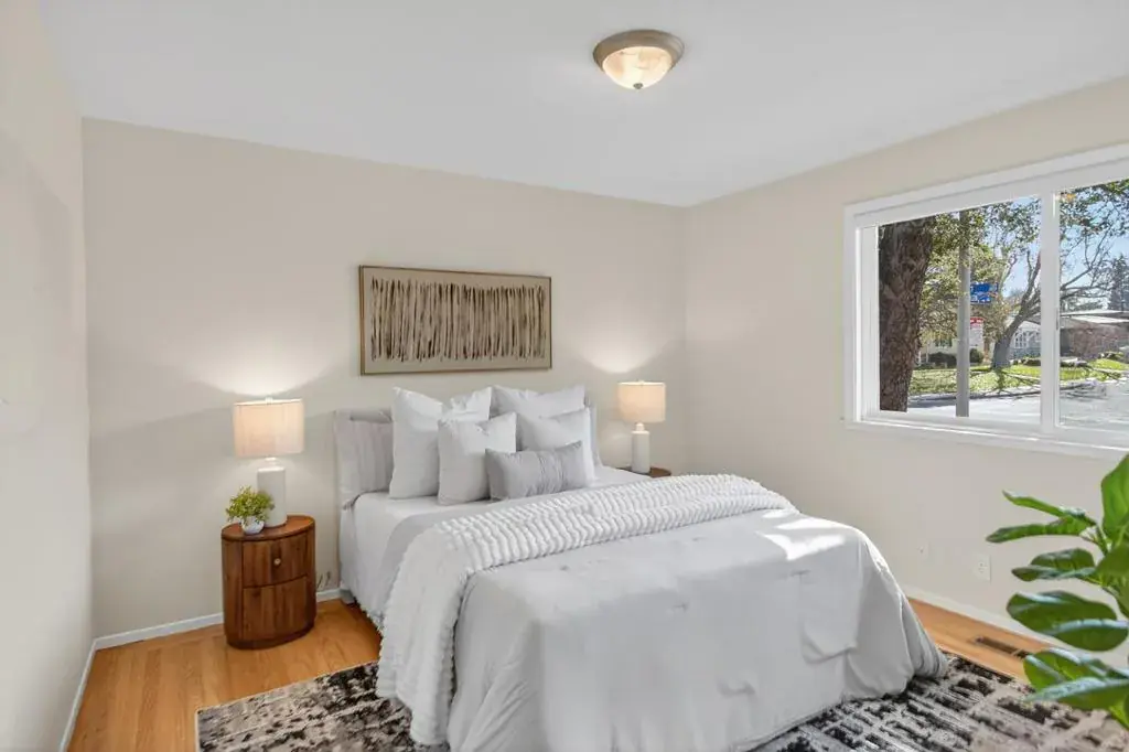 Fabulous Hayman home with top-rated Los Altos schools in the highly desirable Gest Ranch neighborhood of Mountain View bordering Los Altos. This well-built, well-maintained ranch home offers a functional single-level floorplan with an open, spacious contemporary aesthetic, abundant natural light, and beautifully landscaped outdoor spaces. Light-hued, newly refinished hardwood floors extend throughout, complemented by expansive windows. Substantial remodeling and updating in 2011 expanded the kitchen and primary suite. The large skylit kitchen is bright and well-designed with quartz countertops, quality appliances, and an island with elevated bar seating, opening to the family and dining spaces for everyday living and entertaining. Both the front and back yards are professionally landscaped, with a large Connecticut bluestone patio, granite millstone fountain, drought-tolerant plantings with color in four seasons, mature trees, and lush lawn areas, offering multiple areas to relax, play, and gather. Conveniently located steps from Saint Francis High School and close to parks, shopping, dining, and main commute routes to major employers, this home combines classic appeal, livable design, and an excellent Silicon Valley location.