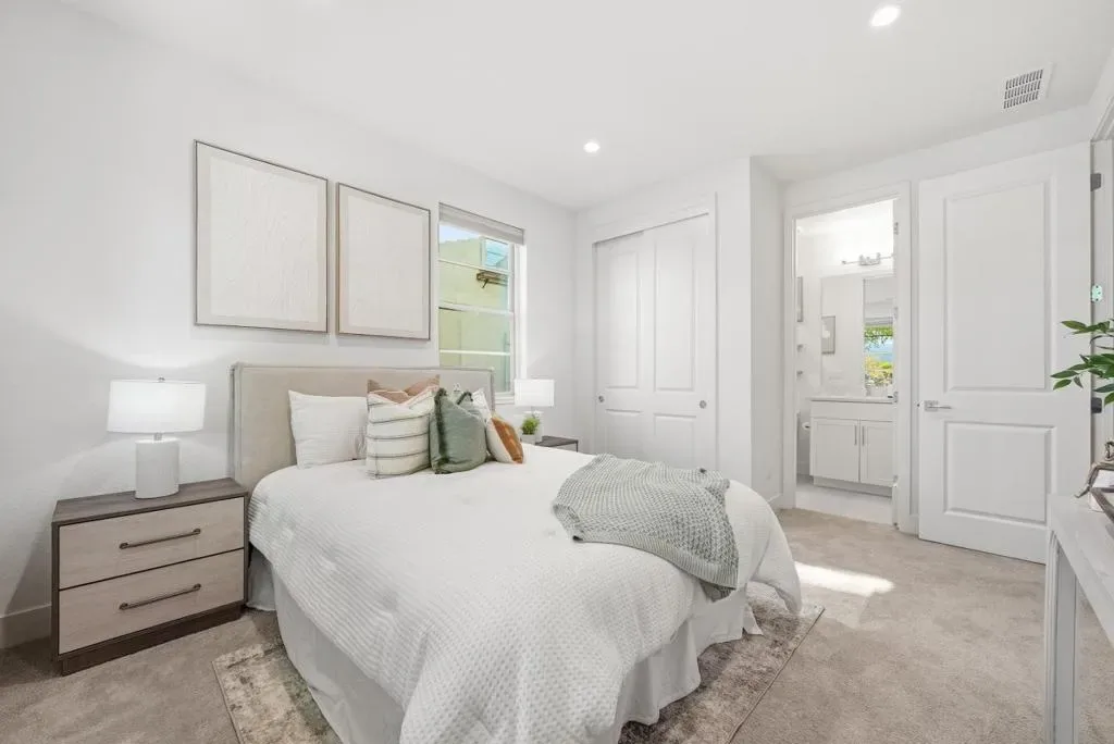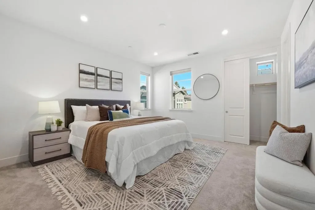 Welcome to this beautiful 2024-built end-unit townhome with 4 beds and 3.5 baths in convenient Mountain View. The home greets you with a cozy gated front yard. A ground-level suite with a bedroom and a full bath featuring a stall shower offers great flexibility for guests or extended family. The second level features an open floor plan with a spacious living room filled with natural light from large windows, flowing seamlessly into the dining area and a modern gourmet kitchen with an island, stylish countertops, a beautiful backsplash, stainless steel appliances, and ample cabinetry. There is a door to a private balcony for relaxation. A half bathroom is conveniently located nearby. The third floor hosts the primary suite with a spacious bedroom, a walk-in closet, and a modern en-suite bath with a double vanity and a stall shower. Two additional bedrooms share a full bathroom with a double vanity and a shower over tub. A washer and dryer on the same level add everyday convenience. Enjoy a prime location near restaurants and grocery stores, including Costco and Safeway, just minutes from Google and Microsoft, with easy access to Hwy 101 and 85 for a short commute to major tech companies. Zoned for top-rated Los Altos High School. Do not miss this great opportunity!