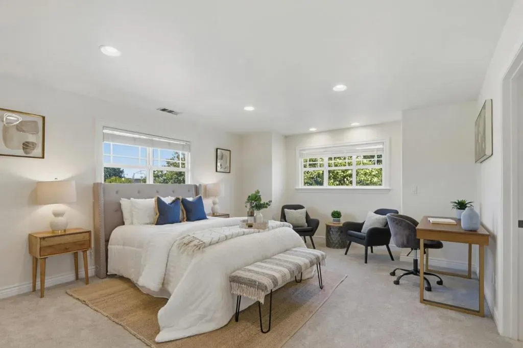 Charming and beautifully maintained four-bedroom Craftsman in the heart of Mountain View. Enjoy an inviting wraparound porch perfect for entertaining, morning coffee, and those warm California evenings. Flexible and open floor plan with a main-level bedroom and full bathroom ideal for guests, multigenerational living, or a home office, with built-ins including a Murphy bed. Light-filled living and dining spaces feature high ceilings, wood floors lower level only, and custom baseboards. Upstairs offers three spacious bedrooms: new carpet in all rooms, a primary suite with walk-in closet and spa-style bath. All bathrooms feature tile flooring.Relax in the private, low-maintenance backyard with raised deck, turf, and mature fruit trees, including citrus and avocado. Prime location near major tech campuses, shopping, dining, and easy freeway access. One-car garage with ample storage, plus driveway and street parking. Owned solar system installed by the seller. Los Altos High School, buyer to verify. Welcome home!