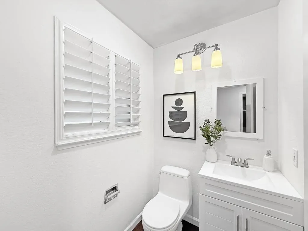 Welcome to this well-maintained townhouse-style condominium in a centrally located Mountain View community. This two-story home features a functional layout with laminate flooring throughout the main living areas, a cozy fireplace, and an updated kitchen with quartz countertops, stainless steel appliances, and ample cabinetry. A convenient half bathroom is located on the ground level. Upstairs, two well-proportioned bedrooms offer comfortable living, including a larger bedroom with access to a private balcony overlooking the backyard patio. The full bathroom has been updated with a modern vanity, and the upper-level laundry area adds everyday convenience. The spacious private backyard patio provides a great setting for outdoor dining or relaxation and opens toward the community’s landscaped grounds. As an end unit, the home benefits from added privacy and natural light. Additional features include a detached one-car garage, an assigned parking space, and access to Country Village HOA amenities, including a community pool and walking paths. Ideally located near Downtown Mountain View and Castro Street, known for its boutique shops, cafes, and restaurants, this home also offers convenient access to parks, major employers, and key commute routes.
