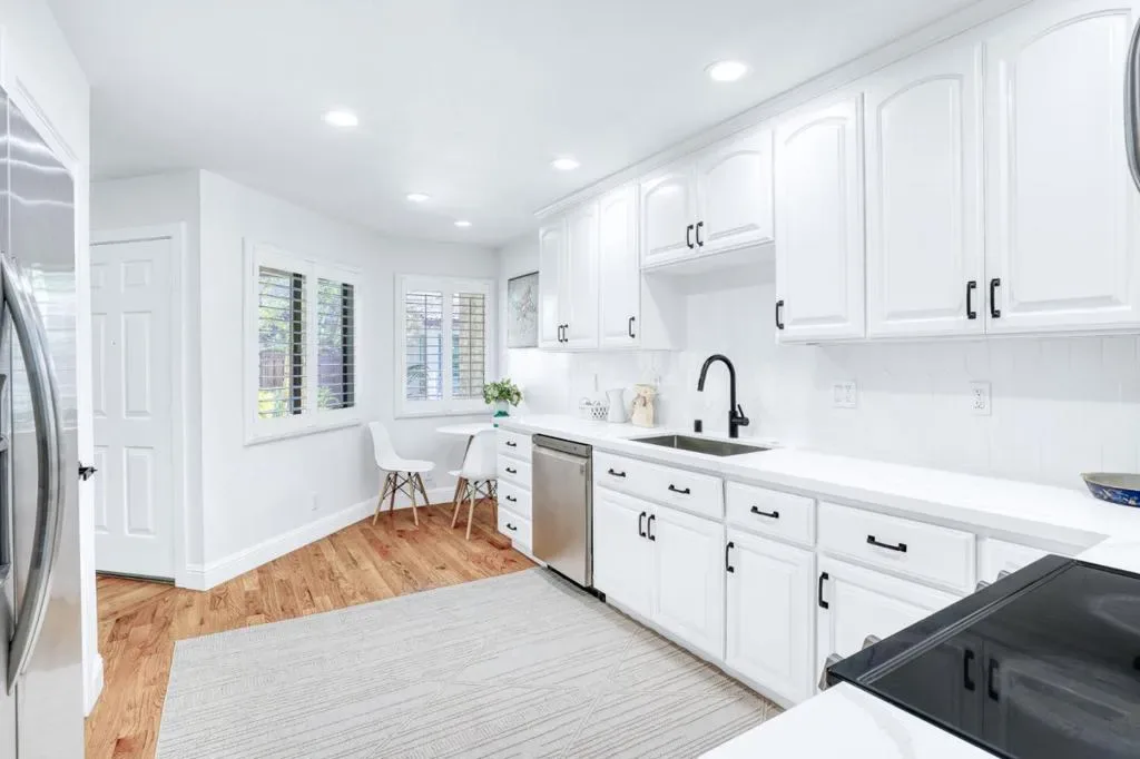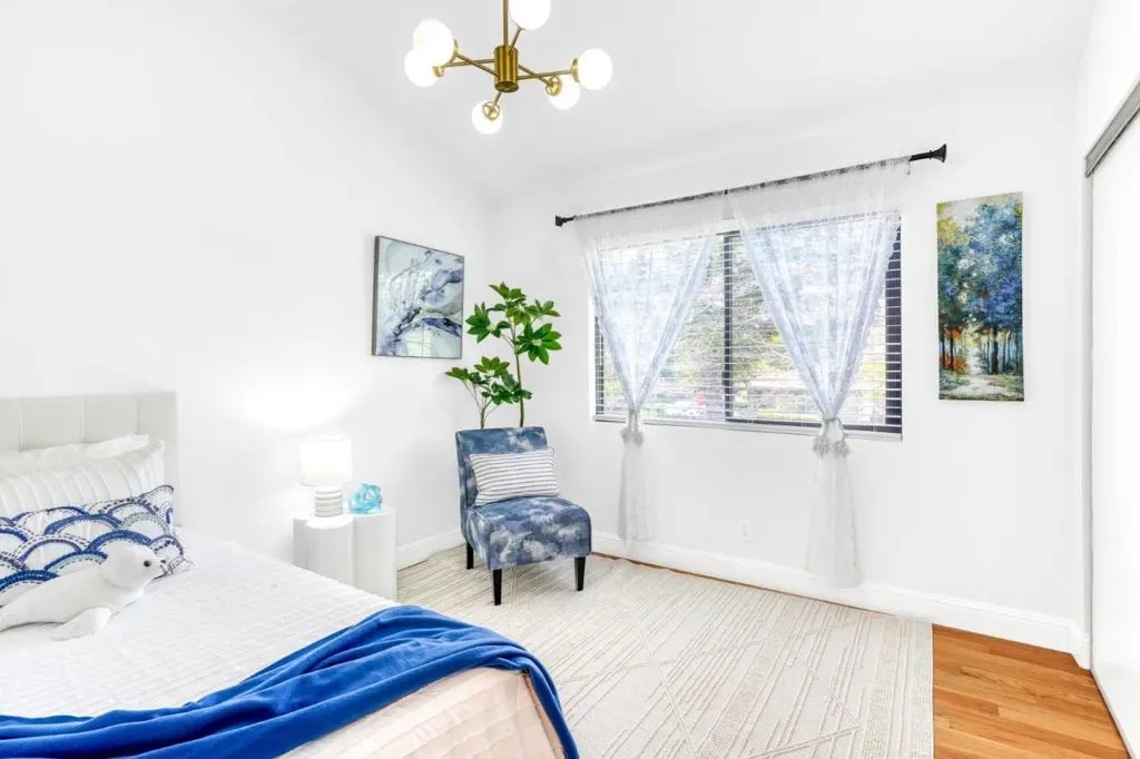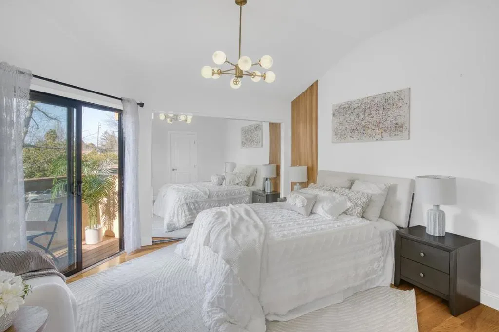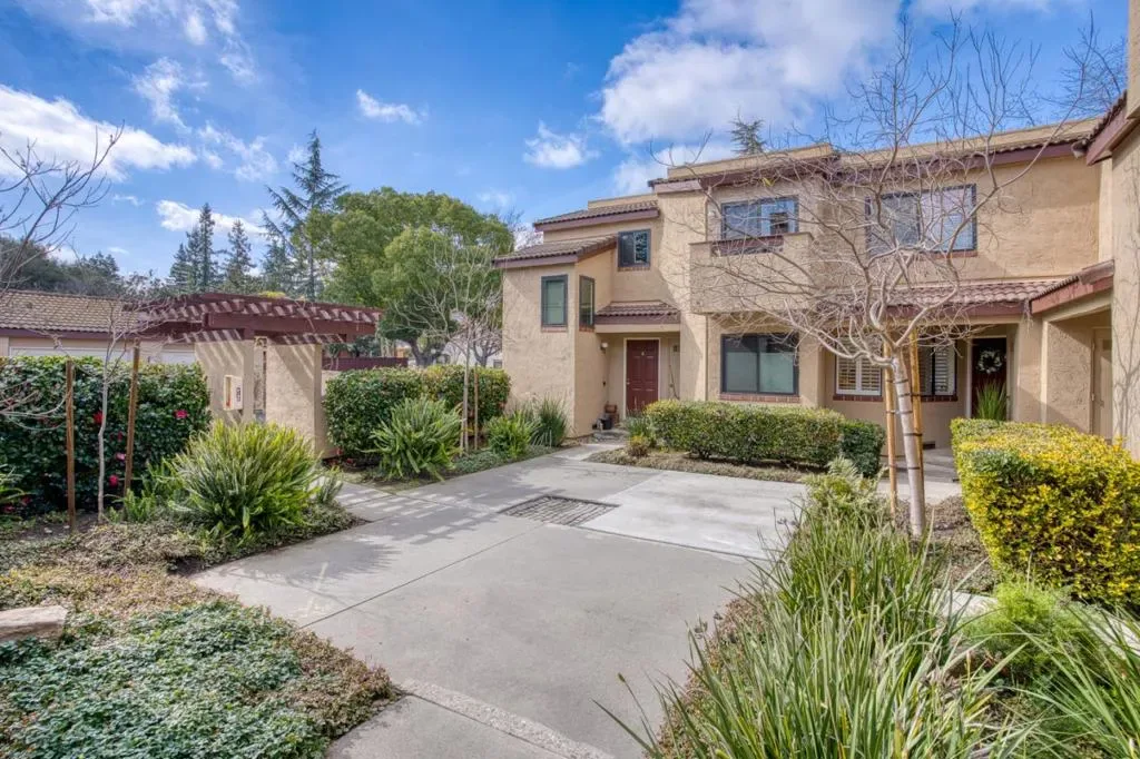 This stylish, majorly remodeled two-story townhome is truly move-in ready. Ideally situated on a desirable corner setting, the home enjoys open, unobstructed views and exceptional natural light. The living and dining areas are filled with sunlight from two high windows and two sliding glass doors. A surprisingly spacious kitchen and open living and dining areas come together in a modern floor plan. The well-designed two-story layout adds everyday ease and functionality. Sliding doors open to a private backyard, creating seamless indoor-outdoor living. Upstairs offers three light-filled bedrooms, all with vaulted ceilings. Soaring ceilings enhance both levels. The primary suite features vaulted ceilings, a spacious closet, and sliding doors opening to a private balcony. The remodeled kitchen features quartz countertops, quality brand appliances, and a side-by-side washer and dryer. Additional highlights include 2.5 renovated bathrooms, central AC, hardwood flooring, recessed LED lighting throughout, and a fashionable chandelier. The property includes a one-car garage plus a dedicated parking space. Extremely convenient transportation and a top-tier school district Mountain View High.