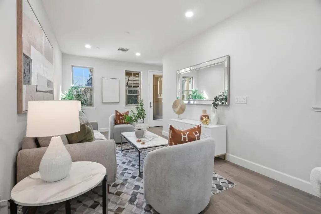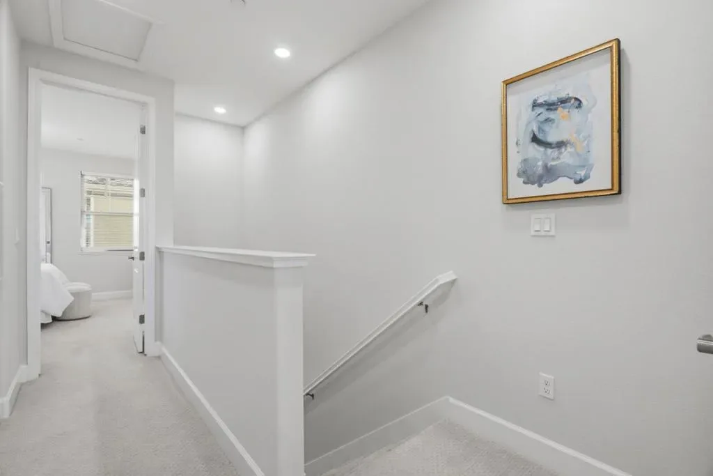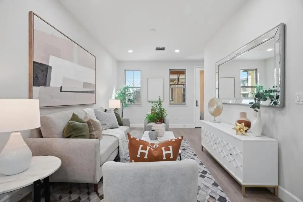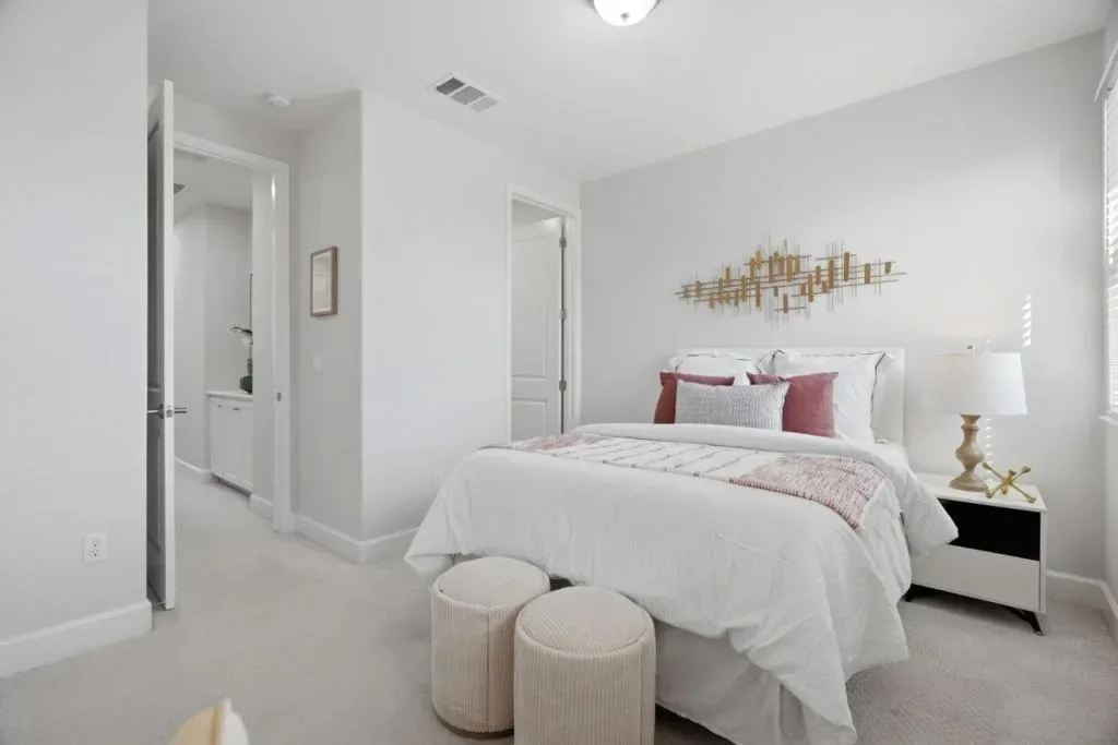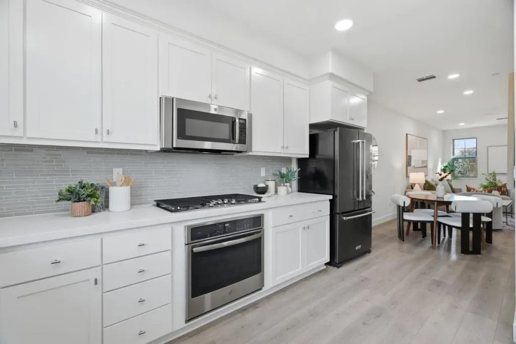 Built by Taylor Morrison in 2018, tucked away in the back of the community, this modern townhouse features 2 bedroom suites each with en suite bath plus a half bath. Open-concept living, dining & kitchen with recessed lights plus French door to balcony for al fresco enjoyment. Open & spacious kitchen features refinished cabinetry, quartz countertops w/ linear tile backsplashes and a huge walk-in pantry. Stainless steel appliances include a GE gas cooktop, microwave, oven, dishwasher, KitchenAid refrigerator. Primary bedroom suite has a full wall of closets and an en suite bath with furniture-style dual-sink vanity plus a large frameless-glass shower with bench seating. Second bedroom suite has en suite bath with single-sink vanity and tub with overhead shower. Adding to the appeal: dual paned windows, central air conditioning, inside laundry with washer and dryer; tankless water heater; attached 2-car tandem garage with storage space, EV outlet, and direct access to the home; Ring video doorbell; ample guest parking. Located at one end of a central community park with playground, BBQ & picnic tables. Minutes to Silicon Valley tech companies, including Google, Meta, NASA, Amazon and vibrant Castro Street, down the street from Stevens Creek Trail; easy access to 101, 85, 237.