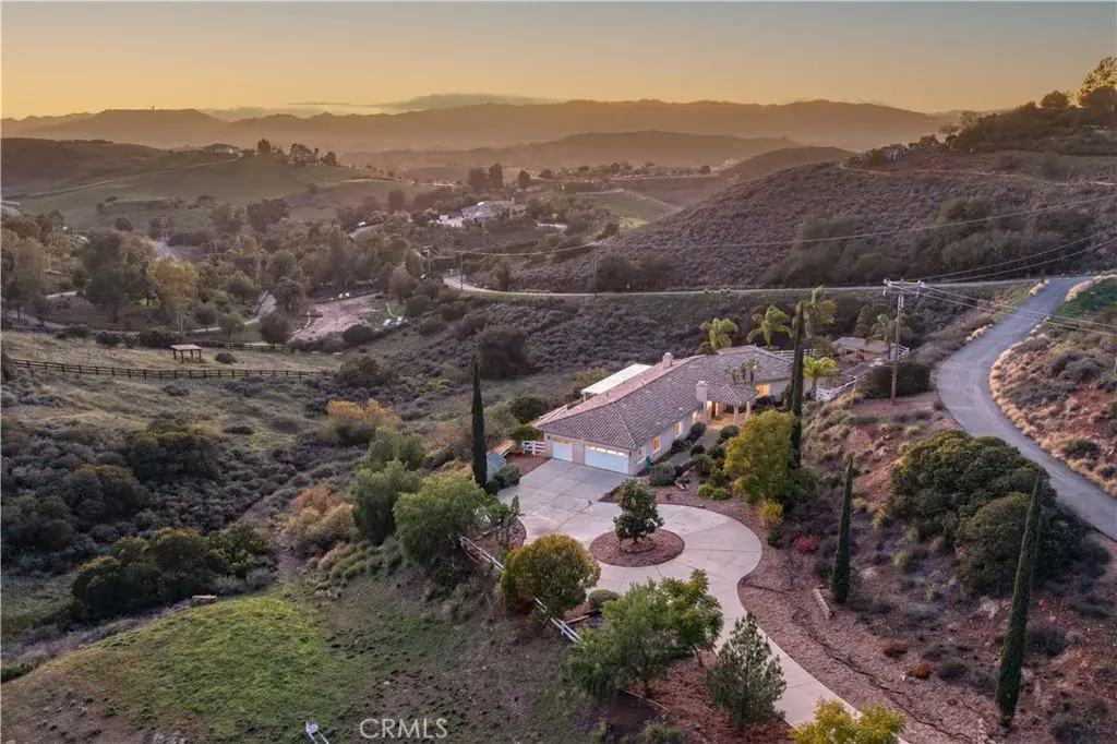 Welcome to your dream retreat situated on the scenic Santa Rosa Plateau in La Cresta. This stunning custom single-family residence sits on a sprawling 5 acre parcel, ensuring both privacy and tranquility while still enjoying the warmth of a close-knit community. Designed for comfortable, upscale living, this 3,317 sq ft home features an open floorplan, five spacious bedrooms, and three luxurious bathrooms — perfect for families of any size or those who love to entertain. Step into sophistication and charm with elegant 12-inch crown molding, high ceilings, and rich hardwood flooring throughout. The heart of the home is the expansive family and dining rooms, seamlessly connected by a dual fireplace that creates an inviting atmosphere for gatherings. An additional fireplace in the living room adds warmth and ambiance to your evenings. The gourmet kitchen will delight the home chef with Corian countertops, a center service island with breakfast bar and ample space for culinary creativity. Whether you’re preparing everyday meals or hosting festive celebrations, this kitchen is designed to inspire. Ideal for multi-generational living, the attached “Next Generation” unit provides comfort and independence. Complete with a full bathroom and a kitchenette, it is perfect for extended family or guests. Embrace the beautiful California outdoors from the expansive rear deck, offering breathtaking views of rolling hills and picturesque countryside. The primary suite features a private covered viewing deck, creating a personal sanctuary to enjoy sunrises, sunsets, and peaceful moments. The property includes a fenced area suitable for raising chickens or goats which can easily be converted for horses, making it a perfect fit for animal lovers or hobby farmers. Enjoy the bounty of your own land with a variety of mature, fruit-bearing trees such as peach, persimmon, apple, and fig. La Cresta is renowned for its vibrant social life and supportive family-centered community, yet the 5 acre parcel minimum ensures the ultimate in privacy and seclusion. Here, you have the freedom to relax, explore, and enjoy life at your own pace — all while remaining connected to neighbors and local activities. This extraordinary estate offers the rare combination of luxurious living, multi-generational flexibility, and rural charm. Experience the best of Southern California in a home that truly has it all — space, elegance, and a setting that welcomes both relaxation and adventure.