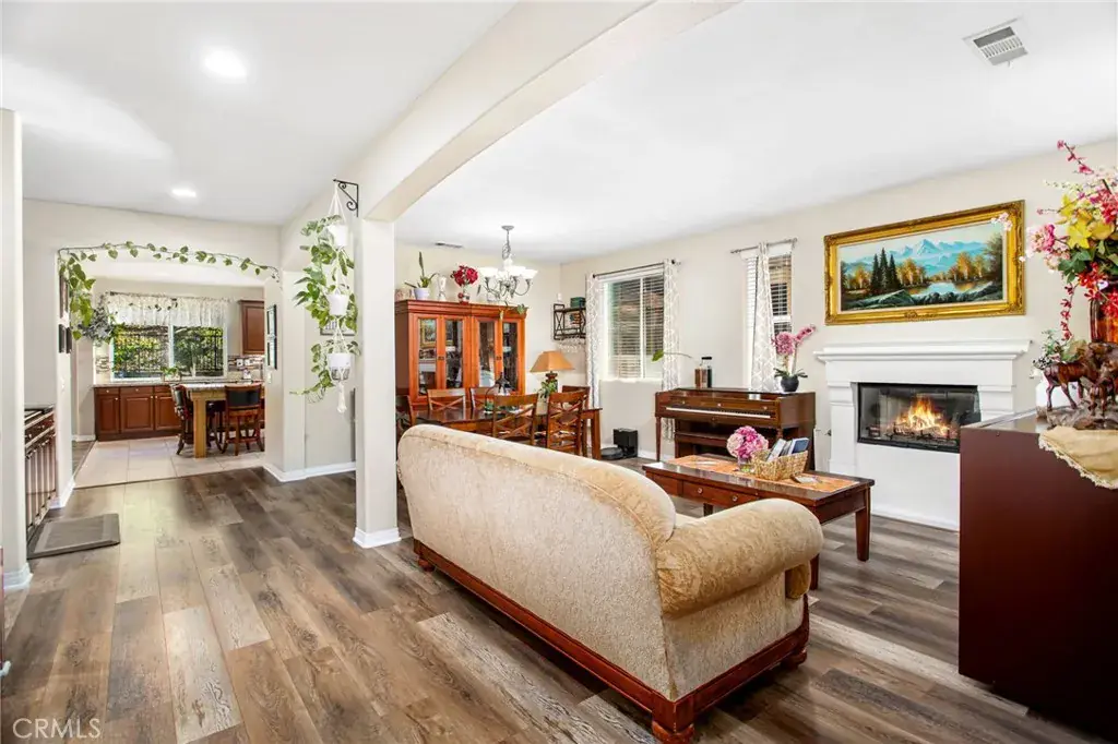 The main level includes a full bedroom and bathroom, ideal for guests, work space, or multi-generational needs. The entry opens to a large formal living and dining area with a fireplace and laminate wood flooring. The kitchen features a substantial center island, granite countertops, double ovens, a gas cooktop, tile flooring, and a walk-in pantry, and it flows into the family room with built-in cabinetry.