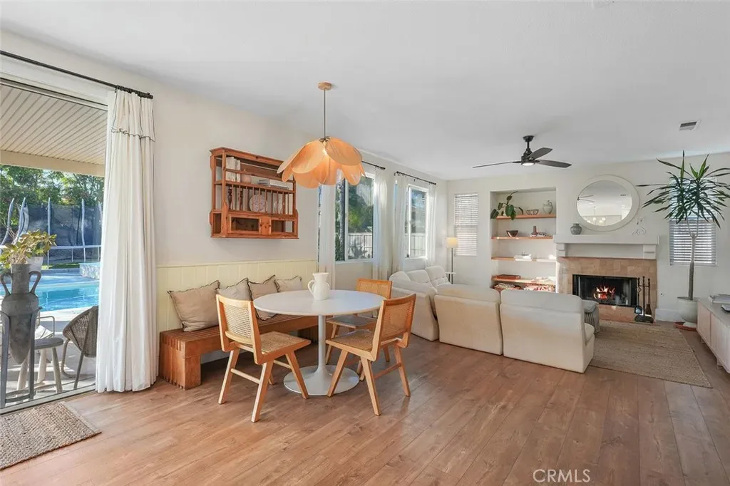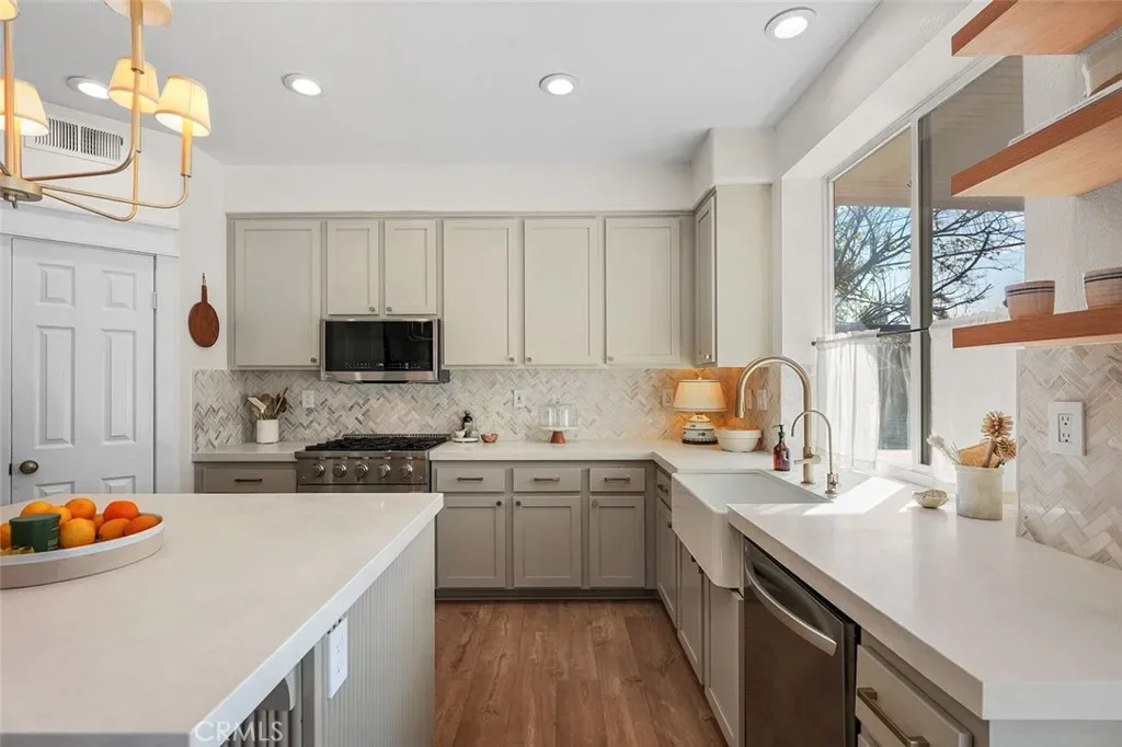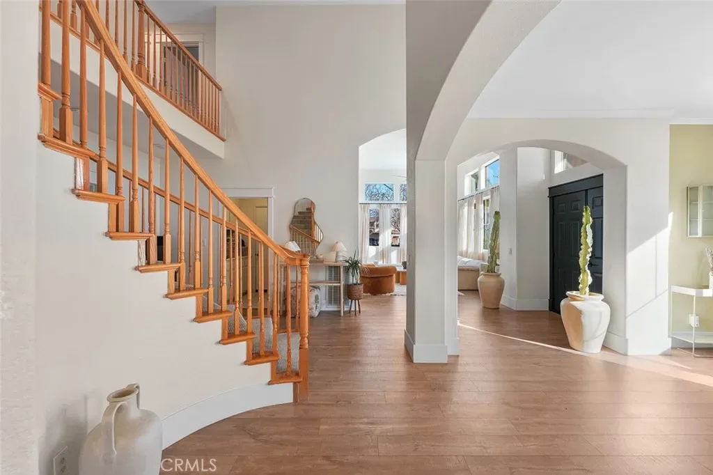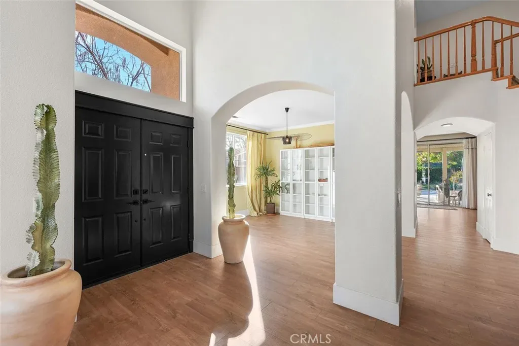 Highly upgraded pool home is priced to sell! This stunning home has been thoroughly updated inside and out and features a massive backyard with a brand-new sparkling pool and spa! And inside the home is pure eye candy, boasting new Quartz countertops throughout, luxury vinyl plank flooring, stainless steel appliances, sink fixtures, hardware, custom lighting, newer windows, paint, A/C unit, whole house fan, and more! The modernized kitchen hits all the marks, with farm sink, gorgeous warm hue Quartz countertops, and designer touches such as the chevron backsplash and soft-bronze finished hardware. From there, the kitchen connects seamlessly to the breakfast area and family room with wood-burning fireplace, creating a cozy, but open main living space. Across the hall is an updated bathroom, a bedroom, a larger formal dining area, and a light-filled, open living room, all illuminated by custom, updated light fixtures that add to the ambiance throughout. Head up the impressive staircase to a spacious loft/bonus room, perfect for a kids’ playroom, media room, or easily converted fifth bedroom. The primary bedroom offers extra flex-space and built-in storage, suitable for a home office, gym, or media room. The primary bathroom features a large soaking tub, a separate shower, and a large walk-in closet. There are two more bedrooms and a bathroom upstairs, all tastefully updated. The backyard is a dream come true where you’ll get to enjoy the SoCal sun in your new pool and spa with top-of-the-line ozone filtering, a large Alumawood-covered patio for lounging and dining under the shade, a large and super useful Tuff Shed, custom outdoor lighting, water-efficient landscaping, and, to top it off, no rear neighbors, culminating in the perfect outdoor living space! The oversized three-car garage includes built-in storage, epoxy-coated floors, and a soft-water system. Come live your best life and