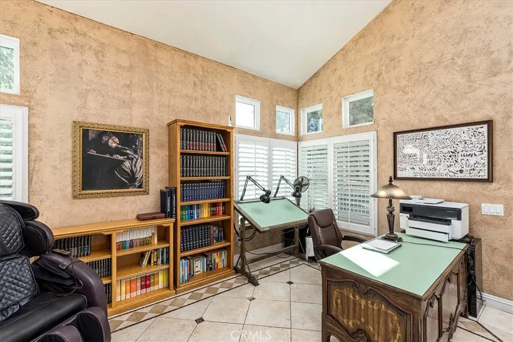 A grand double-door entry welcomes you into soaring two-story ceilings with skylights, creating a dramatic first impression. The Tuscan-inspired gourmet kitchen is a showpiece, boasting high-end appliances, hand-painted rustic tile, and upscale herringbone-patterned tile flooring that elevates the space. The downstairs bedroom has been transformed into a European-style tasting room with a full bath designed to complement its distinctive charm.