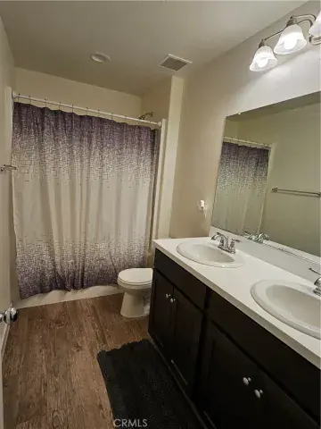 Welcome to this stunning 5-bedroom, 3-bathroom home located in one of Murrieta’s most desirable neighborhoods. Built in 2020, this modern residence offers an ideal blend of comfort, functionality, and convenience—perfect for growing families or multi-generational living. The thoughtfully designed open-concept floor plan features a full bedroom and bathroom on the main level, ideal for guests, extended family, or a home office. The spacious living areas flow seamlessly into the kitchen and dining space, creating a perfect setting for entertaining and everyday living. Upstairs, you’ll find a convenient laundry room, generously sized secondary bedrooms, and a primary suite retreat complete with a walk-in closet and a luxurious double-vanity ensuite bathroom. The upstairs hallway bathroom also features a double vanity, offering added convenience for busy mornings. Step outside to enjoy the beautifully enhanced backyard, featuring a full-length patio cover (spanning the entire backyard except the side yard), equipped with recessed lighting and a ceiling fan—perfect for relaxing or hosting gatherings year-round. Additional upgrades include gutters and leased solar, helping improve energy efficiency.