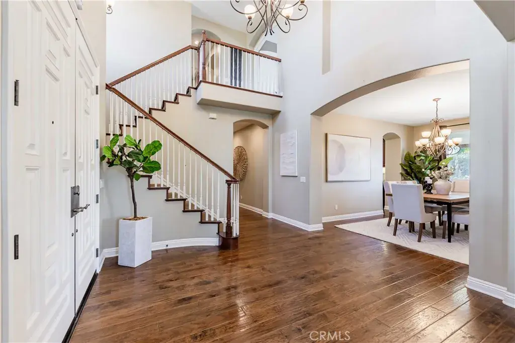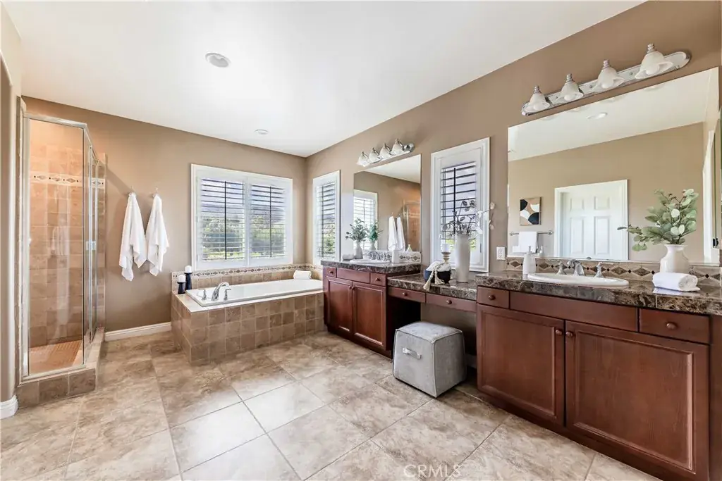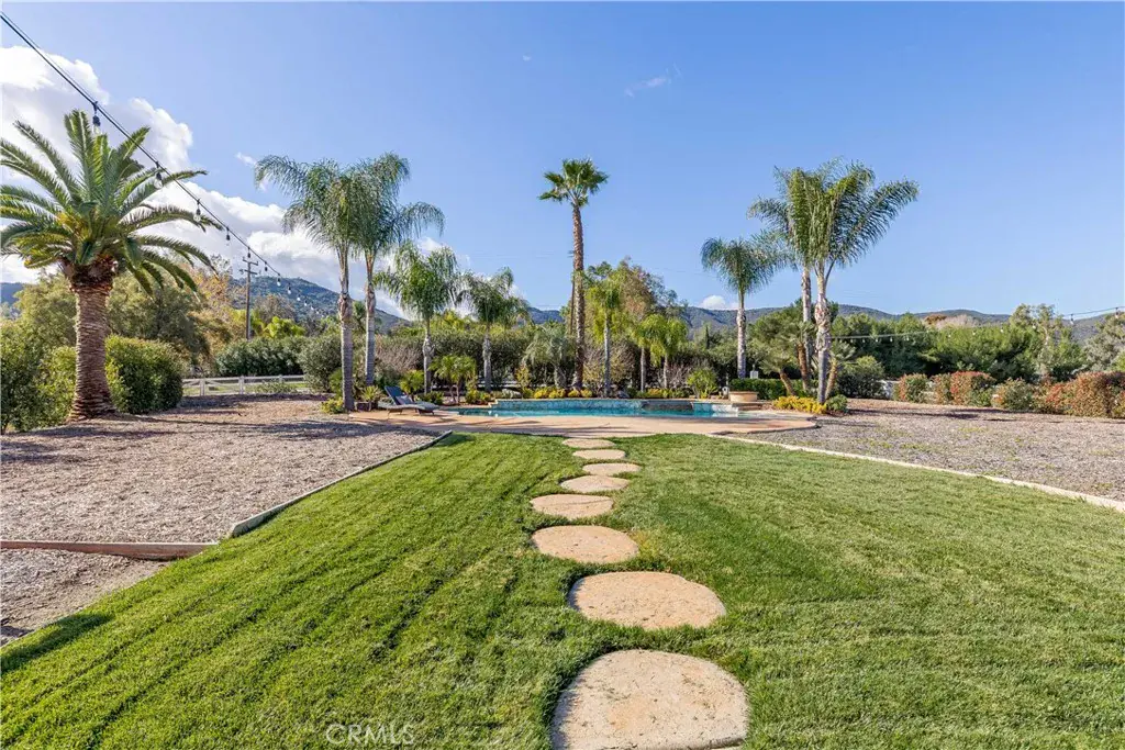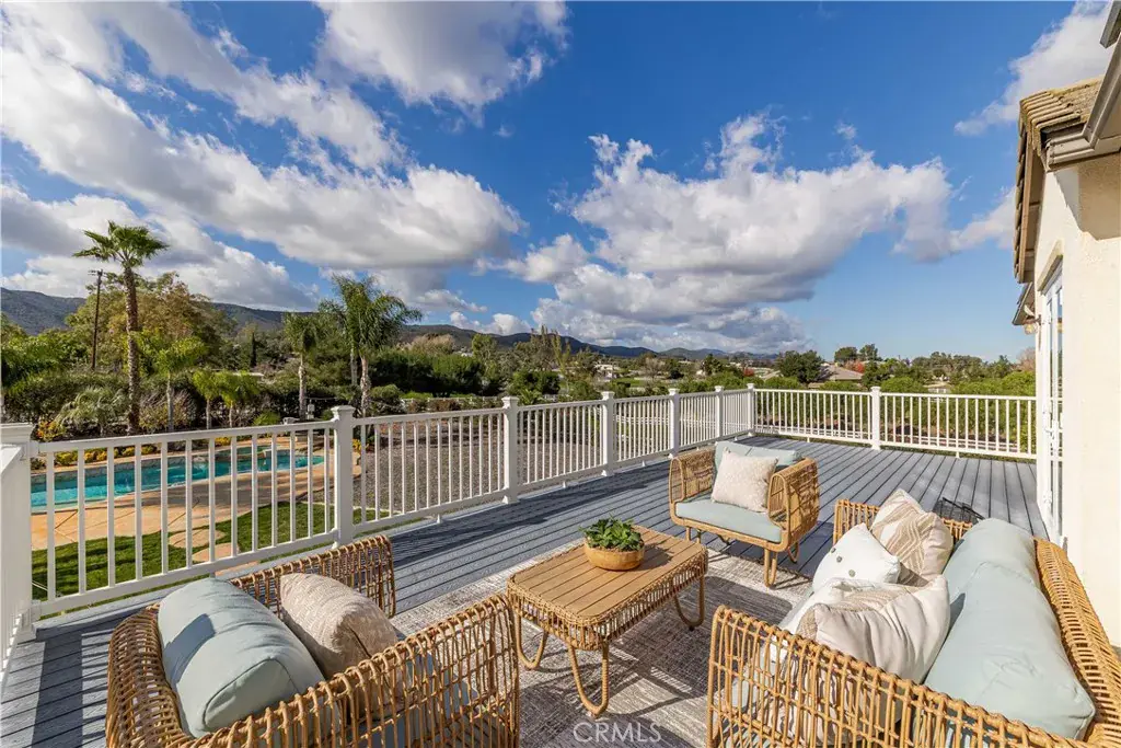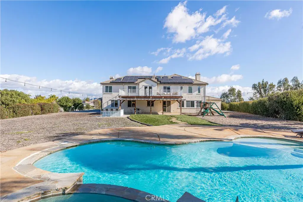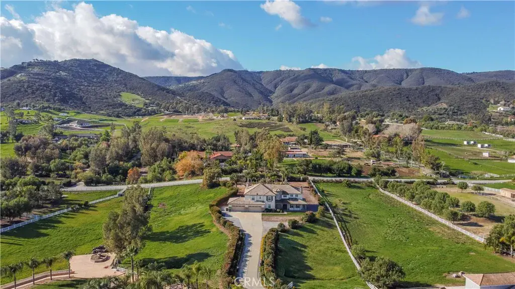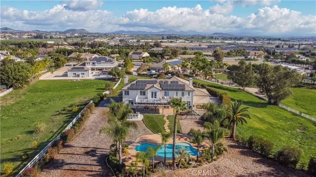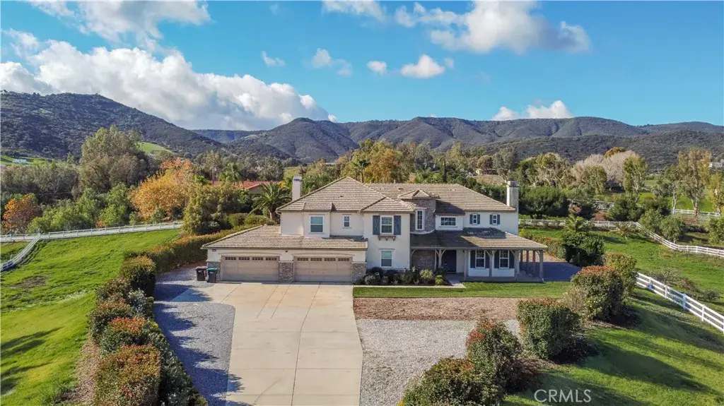 Welcome to this expansive estate nestled within the exclusive gated community of Wynfield Estates in Murrieta. Set on 2.3 acres of private, usable land, this impressive two-story residence offers a rare blend of space, comfort, and resort-style living surrounded by rolling hills, scenic views, and the peaceful ambiance Wynfield Estates is known for. Ideally located near top-rated Murrieta schools, shopping, dining, and Temecula wine country, this home delivers both privacy and convenience. A charming wraparound porch and grand entry invite you inside, where tall ceilings, real wood floors, and abundant natural light create an immediate sense of scale and warmth. The thoughtfully designed floor plan opens seamlessly upon entry, featuring a formal dining room perfect for gatherings, expansive living areas, and an inviting flow throughout the main level. A spacious downstairs office offers views of the backyard and the gorgeous mountain backdrop beyond, creating an inspiring work-from-home setting. A full bedroom and full bathroom on the main level provide flexibility for guests or multigenerational living. Additional highlights include a half bath, storage closet, and a large laundry room with sink and wash-off area. Upstairs, a dramatic stairway window fills the home with natural light and leads to generously sized bedrooms, each with direct bathroom access. The primary suite is a true retreat, showcasing a fireplace, an enormous private deck ideal for taking in the sweeping views, a spacious bathroom with soaking tub and separate shower, and dual walk-in closets. Secondary bedrooms include a Jack-and-Jill configuration and oversized walk-in closets, offering comfort and functionality throughout. Designed for entertaining and outdoor enjoyment, the backyard is a private oasis featuring lush grass, stone pathways, garden beds, a children’s play area, fire pit, and a sparkling pool and spa with spill over into the pool. An Alumawood deck supported by reinforced concrete pillars creates the perfect space for outdoor living, while a prepped outdoor kitchen area awaits completion. Beyond the pool lies over an acre of additional usable land, offering endless possibilities for recreation, expansion, or future amenities. Additional features include a 4-car attached garage with epoxy flooring and paid-off solar. This exceptional estate offers space, privacy, and an elevated lifestyle in one of Murrieta’s most desirable gated communities.